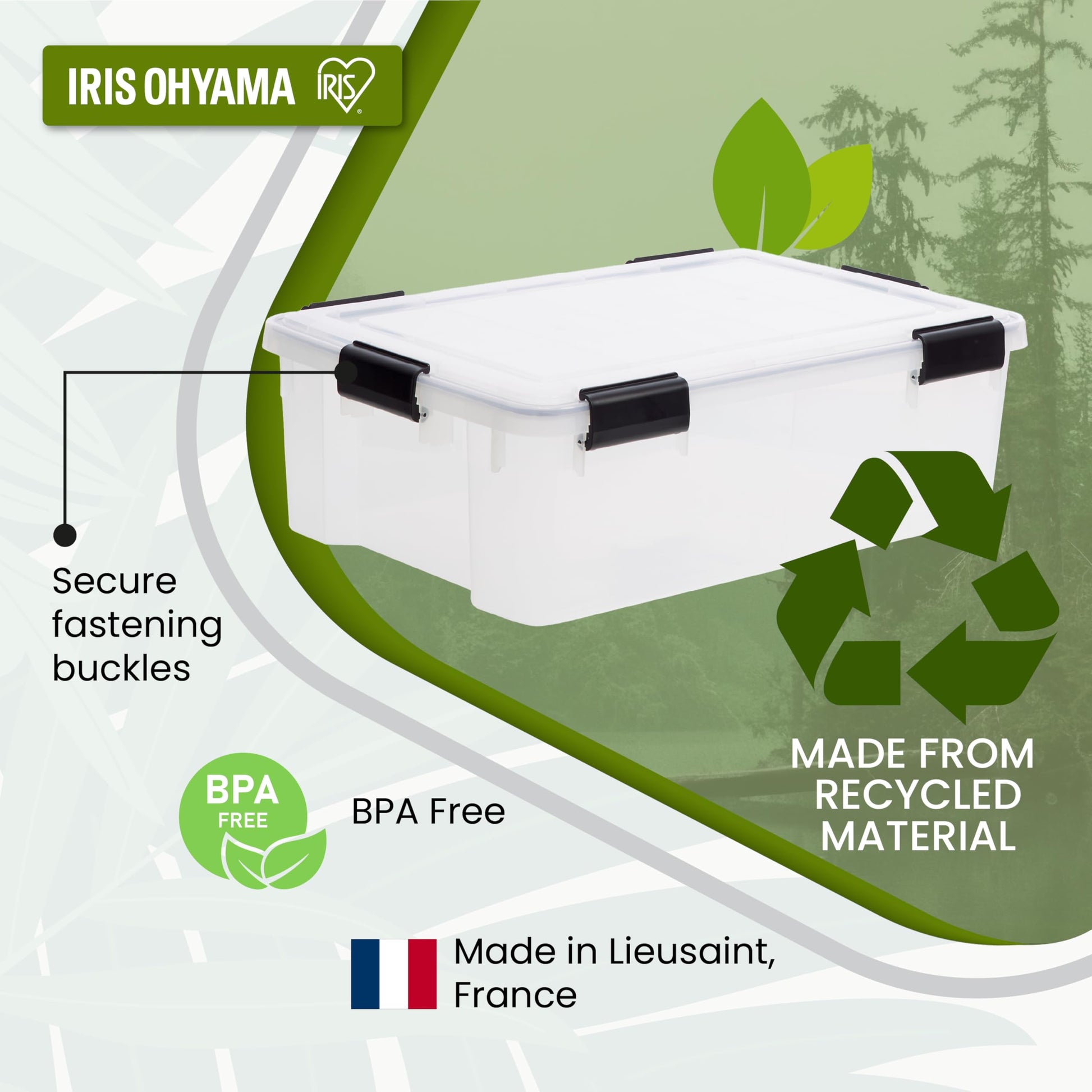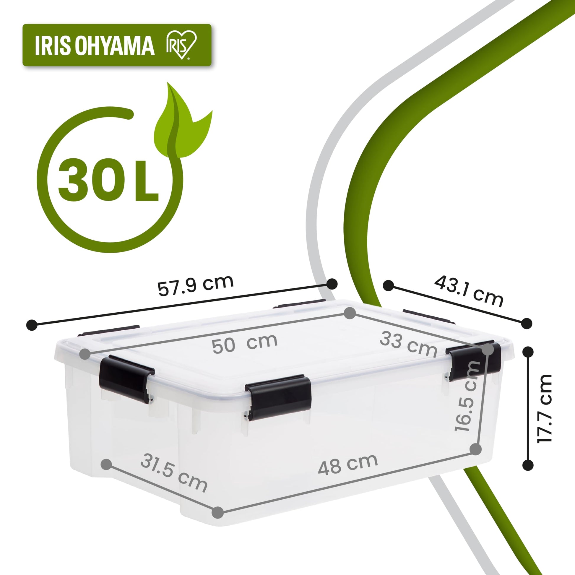 Iris Ohyama airtight plastic storage boxes with lids, 30L, set of 4, Transparent, Hermetic watertight seal, Strong snap locks, Stackable, Dust protection, BPA-free, WSB-30.