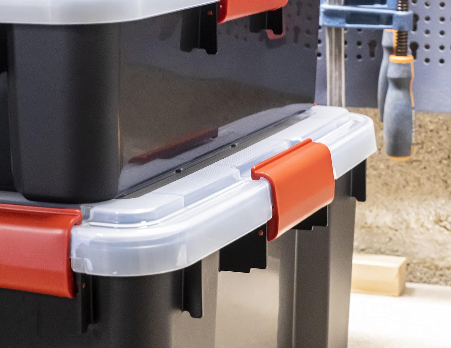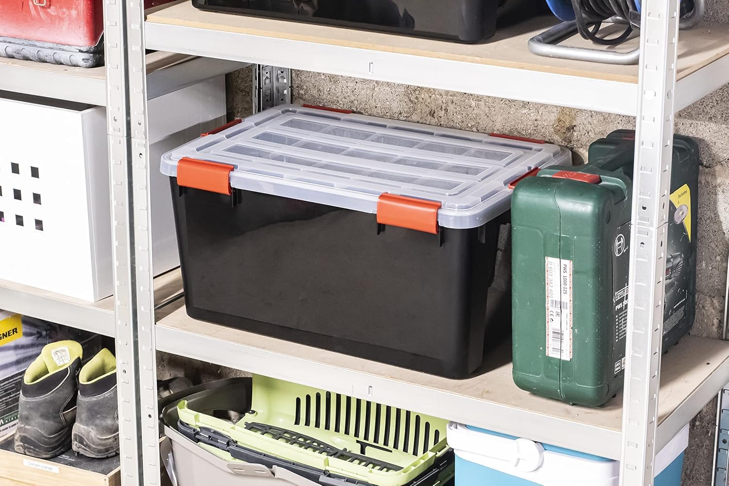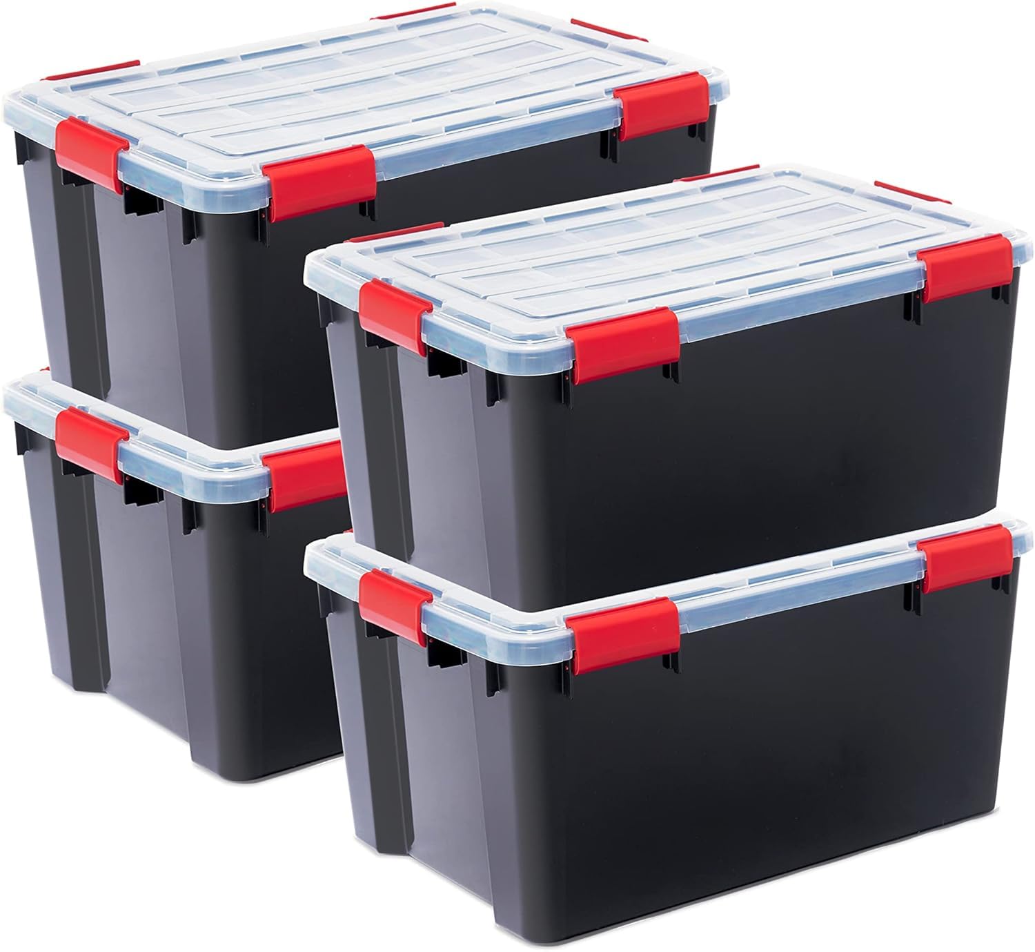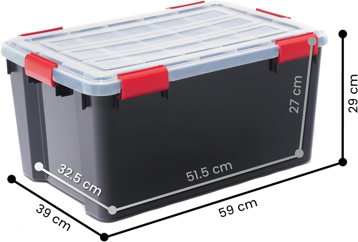 Iris Ohyama airtight plastic storage boxes with lids, 50L, set of 4, black, hermetic watertight seal, sturdy snap closures, stackable, dust protection, BPA-free, DDAT-L