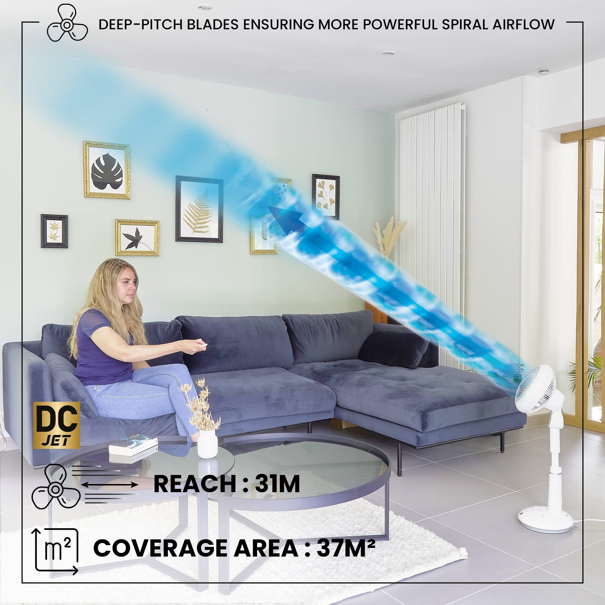 "": "🔇 QUIET AS A WHISPER: 25 dB at low speed, perfect for beside the bed or computer, even during a call. 🌱 ENERGY SAVER: The DC motor optimizes performance and reduces energy consumption. ⏱️ Set the on or off function to 2 / 4 / 8 hours, so the fan turns on just before you arrive home or turns off when you fall asleep.",