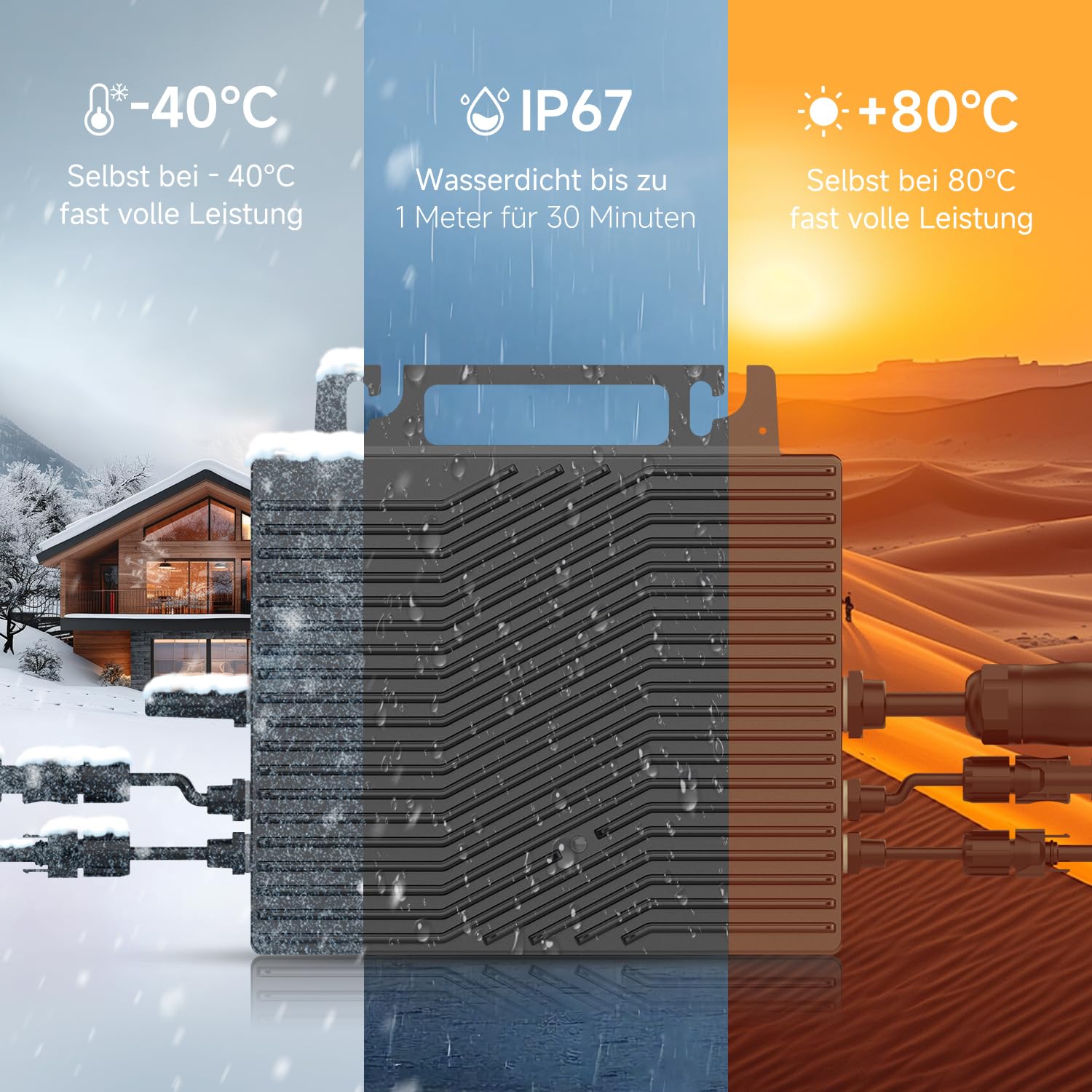 RELIABLE OPERATION UNDER EXTREME CONDITIONS: This 800W inverter operates reliably in a wide temperature range from -40°C to 80°C. With an IP67 protection rating, it is fully protected against dust and water, ensuring stable and efficient performance even under extreme conditions.