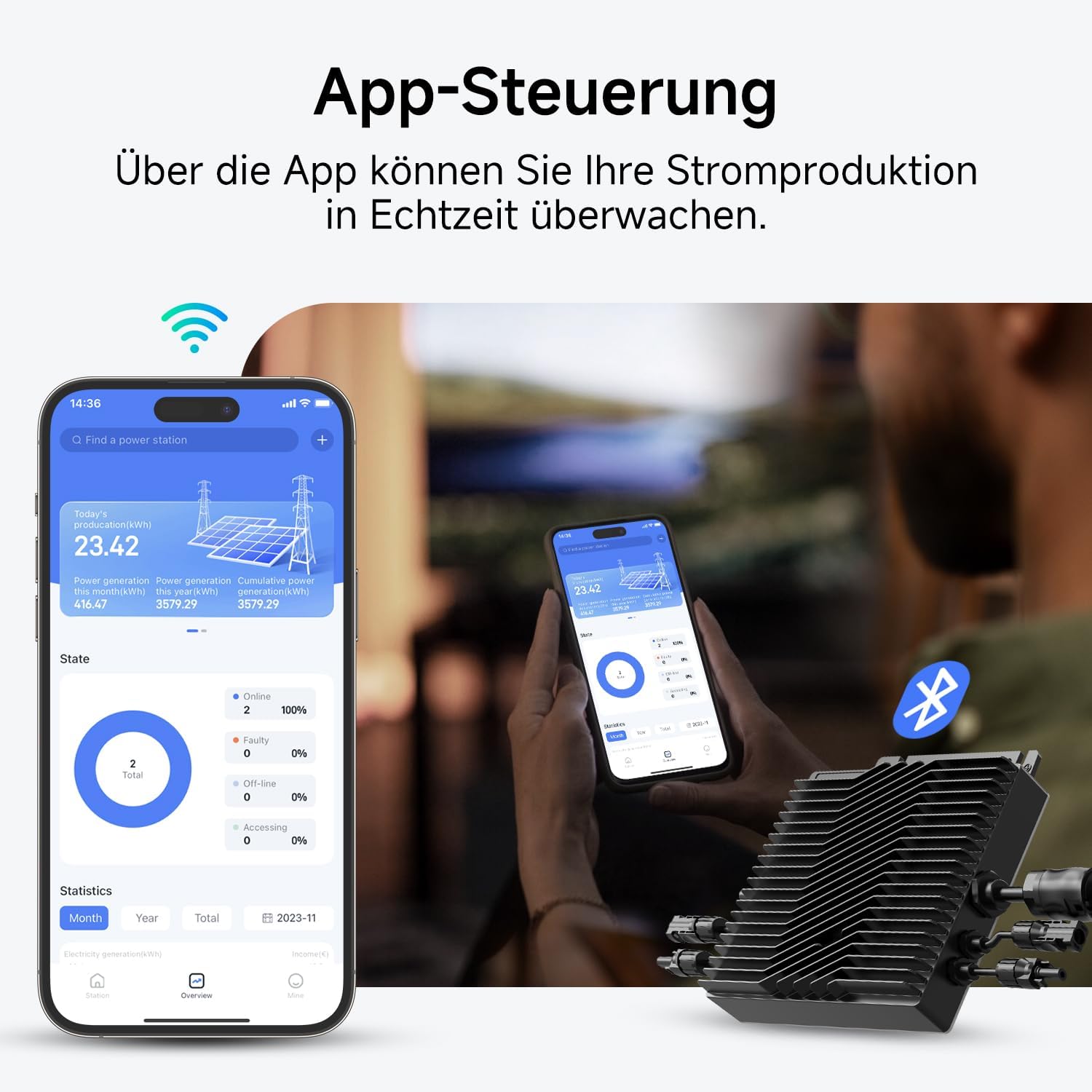 EASY INSTALLATION AND REAL-TIME MONITORING VIA APP AND BLUETOOTH: Installing this micro inverter is easy and requires no complicated steps. Through the user-friendly app and Bluetooth, you can monitor your power production in real-time anytime and anywhere, ensuring maximum control and efficiency."
