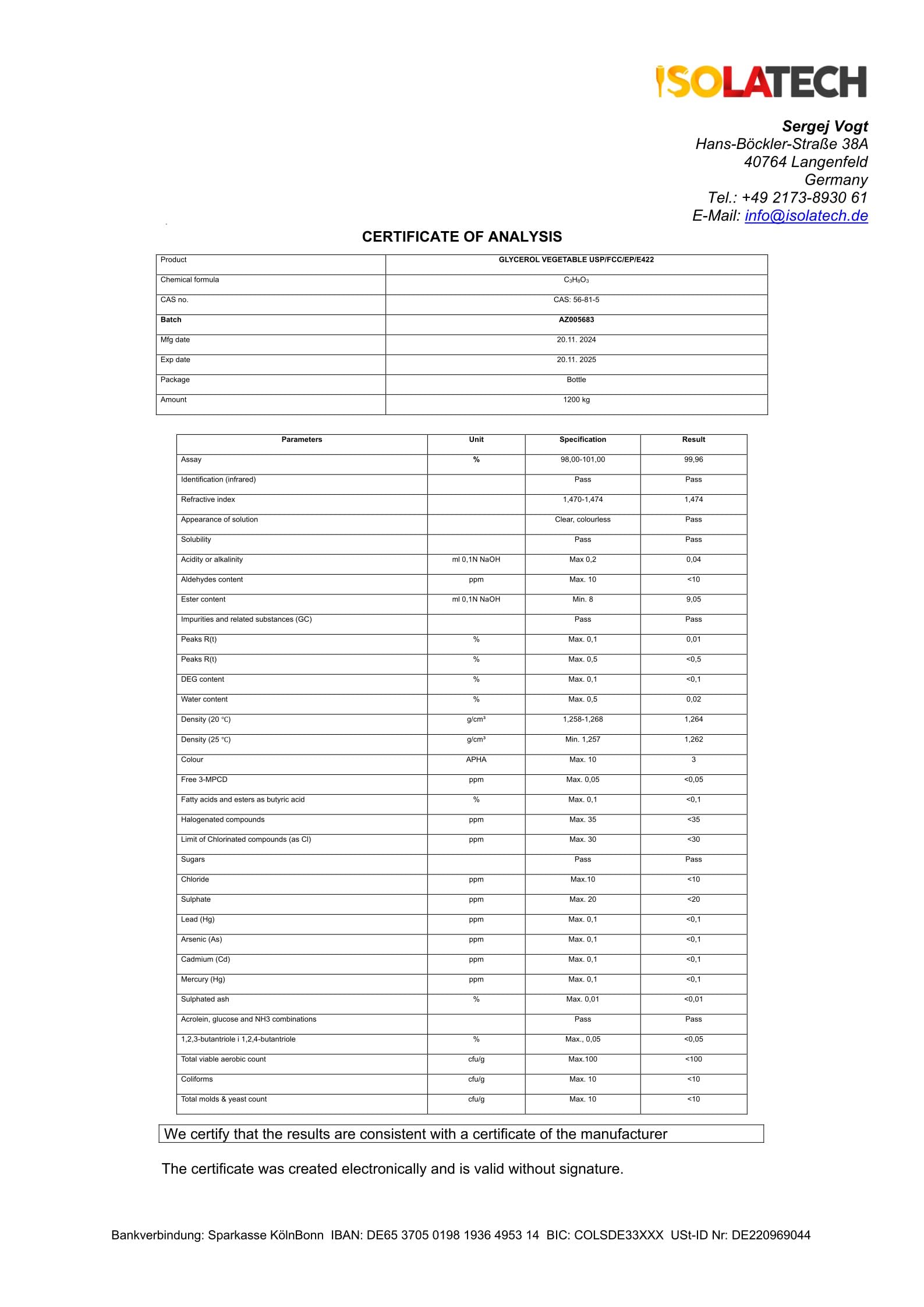 "Glycerin 99.5% is produced in Germany with excellent quality. DAB CAS No: 56-81-5 USP/FCC/EP/E422USP WE No: 200-289. The current analysis certificate can be found on the left in the image gallery."