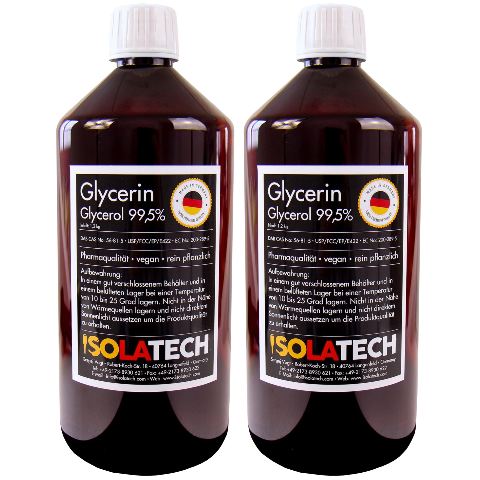 ISOLATECH Glycerin 99.5% 2 liters pharmaceutical grade made in Germany, tested 99.98% pure vegetable, glycerin glycerol liquid transparent 2 x 1000ml bottle (contents 2 x 1.2kg)