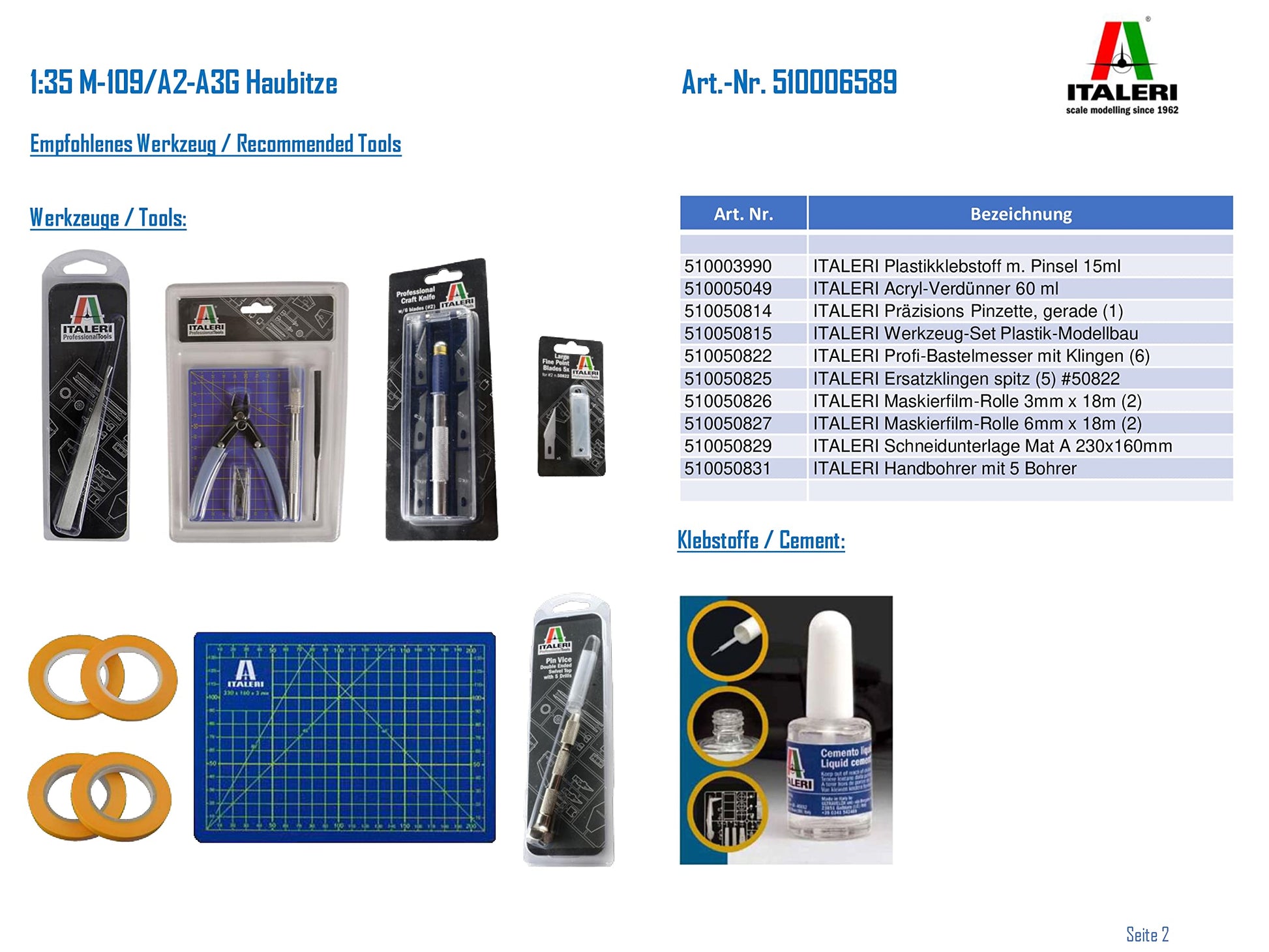 ["Detailed model kit in 1:35 scale.", "The high-quality kit from Italeri must be assembled independently.", "The self-assembly is accompanied by a step-by-step or illustrated assembly instructions. The assembly instructions are included in the delivery.", "Based on the assembly instructions, the precise individual parts must be assembled. The parts can be painted according to personal preferences.", "Tools, glue, and paints are not included in the delivery of the plastic kit. These must be purchased separately."]