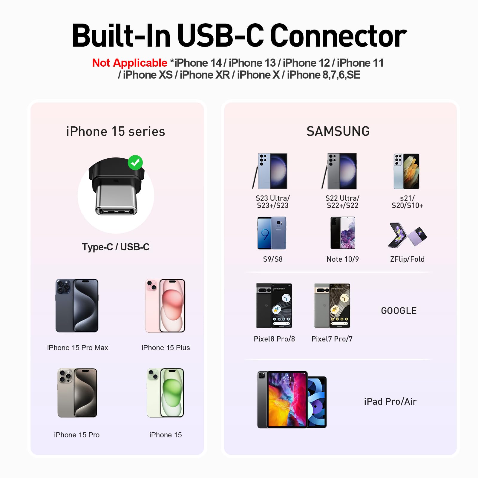 ["Wireless USB-C Charger Powerbank: Iwalk Plug Powerbank gives you hands-free convenience - no need to hold it! Compatible with USB-C devices like the iPhone 15 series and many Android devices for easy charging.","Stylish Design: The new main body is more fashionable and perfectly compatible with most Android smartphones. 3 colors of our Type-C powerbank (White, Black, Pink) are available.","User-Friendly: The plug cover is easier to remove and reattach. The LED indicator light is also softer. With the improved extension of the connector, this external battery is also suitable for most phone cases.","Compact Mini Size: The capacity of the high-quality battery cells has increased to 4500 mAh, but the size of the battery pack has not changed significantly.","Package Includes: 1 x 4500mAh USB-C Powerbank, 1 x Type-C Charging Cable, 1 x User Manual. You will receive 18 months of support."]