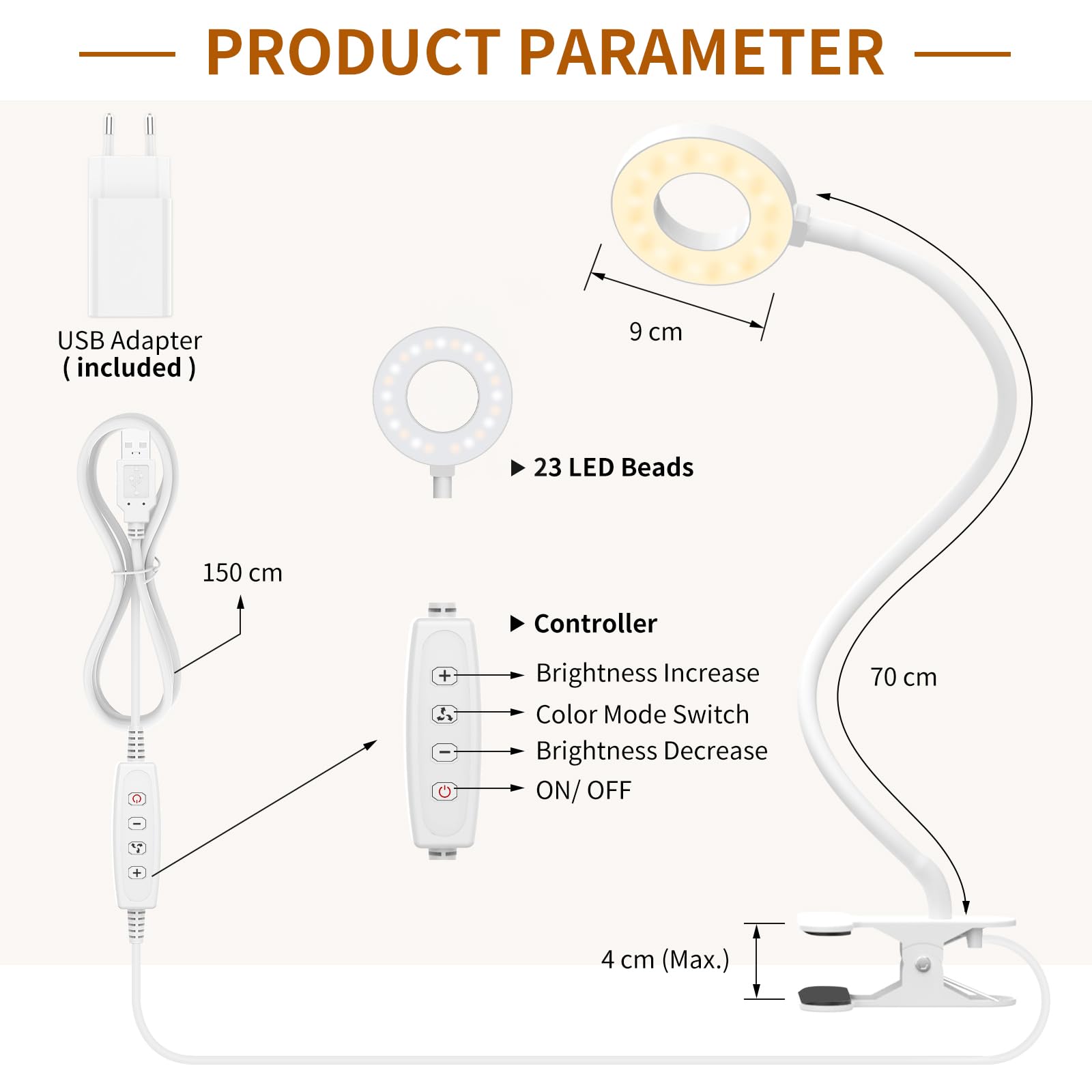 ["ENERGY-SAVING EYE CARE LAMP】With 80% less energy consumption than light bulbs, this desk lamp is ideal for focused and productive work at home. Also suitable for reading, painting, sewing, nail art, tattooing, makeup, or crafts.","【3 COLOR TEMPERATURES & 10 BRIGHTNESS LEVELS】With 23 LED beads, the bedside lamp can adjust the perfect light intensity and color temperature for different scenarios.","【LIGHT MEMORY FUNCTION】Our clip-on reading lamp also has an extremely practical memory function! It remembers the last used settings for color temperature and brightness. So you can immediately return to your preferred lighting atmosphere without having to make the settings again.","【FLEXIBLE SWAN NECK & STURDY CLAMP】The 70cm long, 360° flexible goose-neck tube allows for easy adjustment of the height, distance, and direction of the light. The sturdy clamp can open up to 6cm and is easy to attach.","【USB POWER SUPPLY FOR MORE MOBILITY】Equipped with a 120cm long USB cable and a 5V/2A adapter, this reading light can be easily transported and can also be powered by portable batteries, making it ideal for travel or camping."]