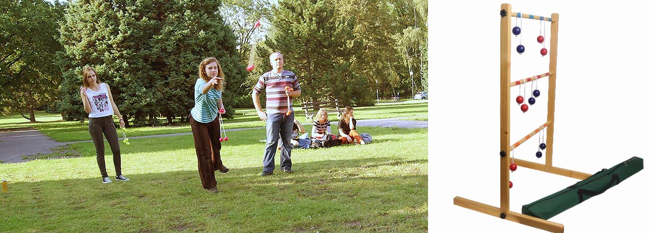 ["Size: 39.37 inches height, 24.41 inches width, 23.62 inches depth", "3 Bolas in yellow, red, green, and blue each", "Includes sturdy carrying bag with zipper", "Solid wood - Pine", "The rods are painted with stripes in green, blue, and orange"]
