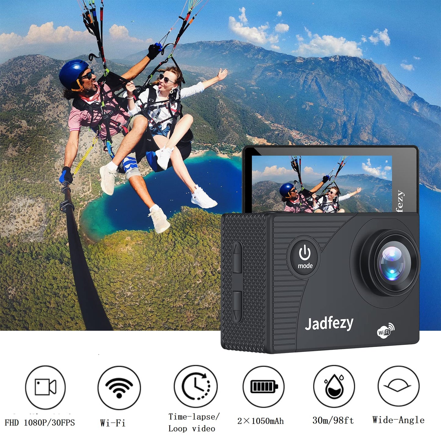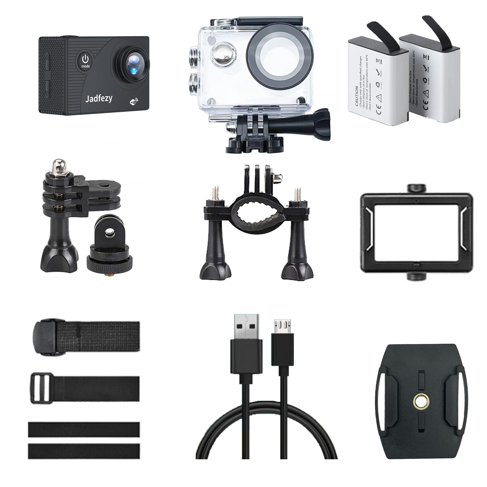 ["【Action Camera WIFI Ultra HD 1080P】Jadfezy WiFi action cam can record videos at a resolution of up to 1080P / 30fps, shoot 12MP photos. With a 2" high definition display, you can easily view the wonderful moments you captured with this sports camera.","【Integrated WiFi Action Cam】Download the free app on your smartphone and connect the action camera via WiFi, you can easily control the WiFi sports camera to start/stop recording, view the videos/photos you shoot, or share your wonderful moment at any time in social media. WiFi signal reaches up to 33 feet.","【2 Rechargeable Batteries Action cam】Jadfezy Action Camera comes with 2 x 1050mAh rechargeable batteries. Each fully charged battery can record over 2 hours of video/photo shooting pleasure, and it's more convenient to recharge the battery.","【30m/98FT Underwater Camera】IP68 certified and sturdy waterproof case supports diving depth up to 30m (98ft). The underwater camera is perfect for water sports like diving, swimming, drifting, surfing, and more, you can capture the beautiful underwater scenery and share it with your family.","【Various Action Cam Accessories】This JadFezy Action Camera also comes with a variety of accessories, in addition to the waterproof case, you will receive the helmet, bike mount kit, suitable for use as a helmet camera, bike camcorder, or motorcycle camera."]