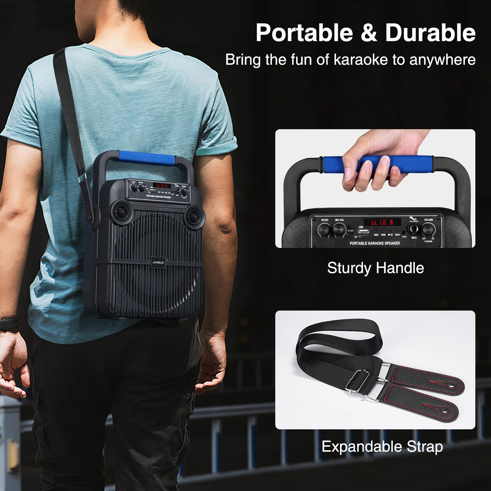 "Excellent Sound Quality: JAMELO portable Karaoke system with 30 w powerful 6.5-inch speaker delivers stronger and clearer HD stereo sound. Great quality sound makes you immersed in joy. No distortion even when you turn up the volume to the max.