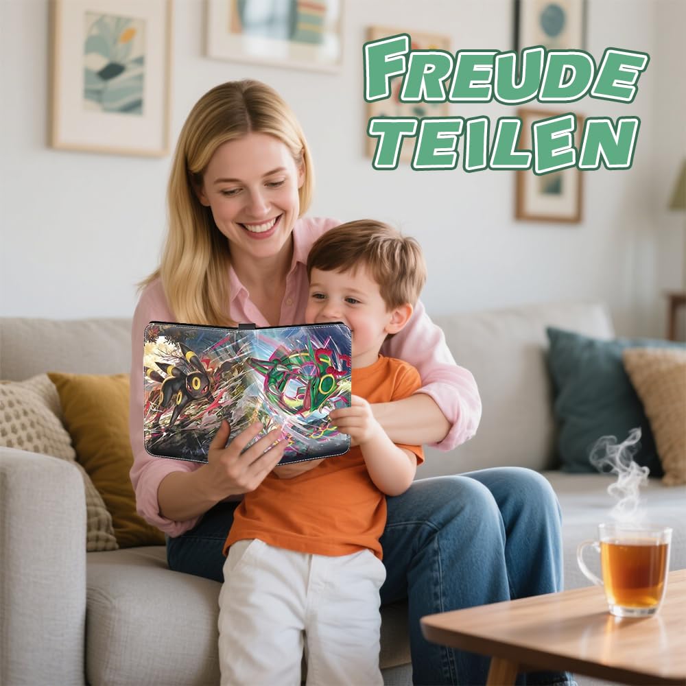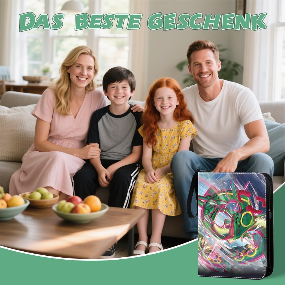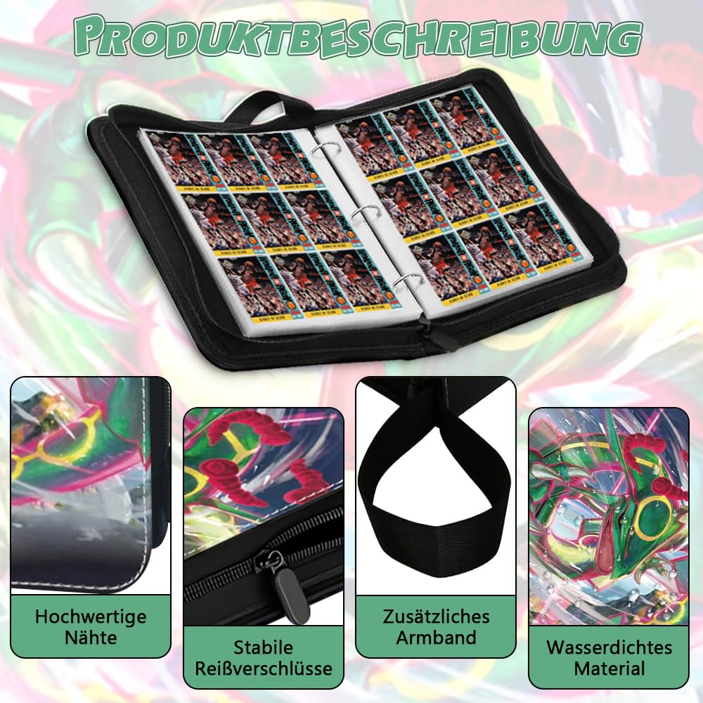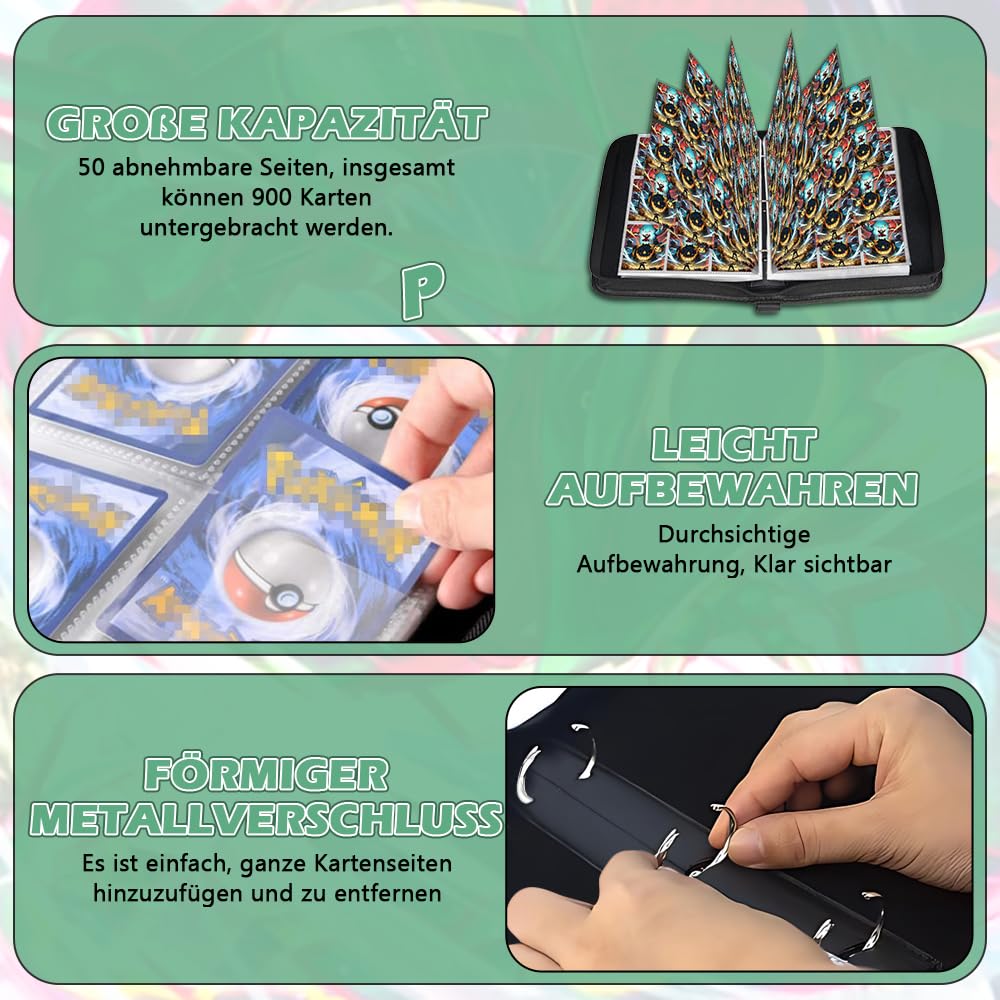 ["Collectors Album Compatible with a Variety of Collectible Cards, Our zippered carrying binder is compatible with standard size collectible cards. Perfect for most standard collectible card games, football cards, and more.", "Security and Good Protection, Our binder has double-sided stitching and can protect your cards well. Covered with PU leather, water-repellent and wear-resistant, dust-proof, wrinkle-free and break-resistant. With the binder, you can protect your cards and make them look like new.", "Large Capacity, 50 pages can hold 900 cards; Three-ring design, can be added or replaced at any time; high-resolution transparent, easy-to-distinguish card album for collecting with zipper and handle, light and portable.", "Perfect Gift, Card collector's album, beautifully printed, unique design, perfect compatibility, can accommodate all kinds of different cards, especially suitable for collectors, perfect for children, friends, family, fans, collector's gift.", "Note, This product does not include playing cards. We provide high-quality after-sales service. If you have any questions, please contact us!"]
