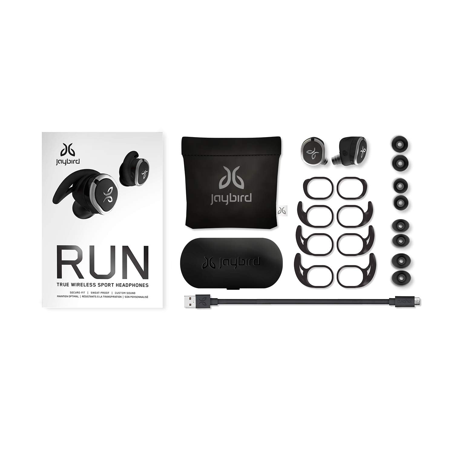 "Sits securely in the ear: A comfortable fit of the in-ear headphones is guaranteed by the interchangeable ear tips and ear fins regardless of the shape of the ear","Sweat-resistant and water-repellent: Sweat as much as you want and train hard in pouring rain and damp mud","Full control: The Jaybird app can help you customize your wireless headphones and also locate them if lost","Long battery life: The RUN Bluetooth headphones can play music for four hours on a single charge, while the charging case provides an additional eight hours","Fast charging: A five-minute quick charge allows for one hour of playback time, so you never have to start your workout without your music","Multitalented: Turn up the music and take calls as needed through the headset microphone, even while in the middle of a training session"