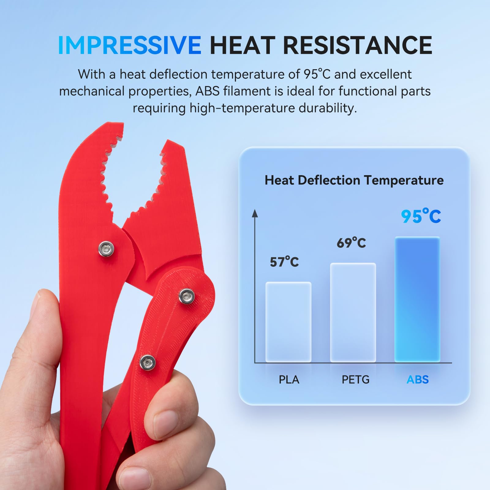 "HEAT-RESISTANT JAYO ABS FILAMENT: Deformation-free at 95°C, automotive-grade heat resistance. Heat deflection temperature (HDT) of 95°C, long-term use in (motor housing sensor/kitchen appliances) and other high-temperature applications, far surpasses the durability of conventional PLA",