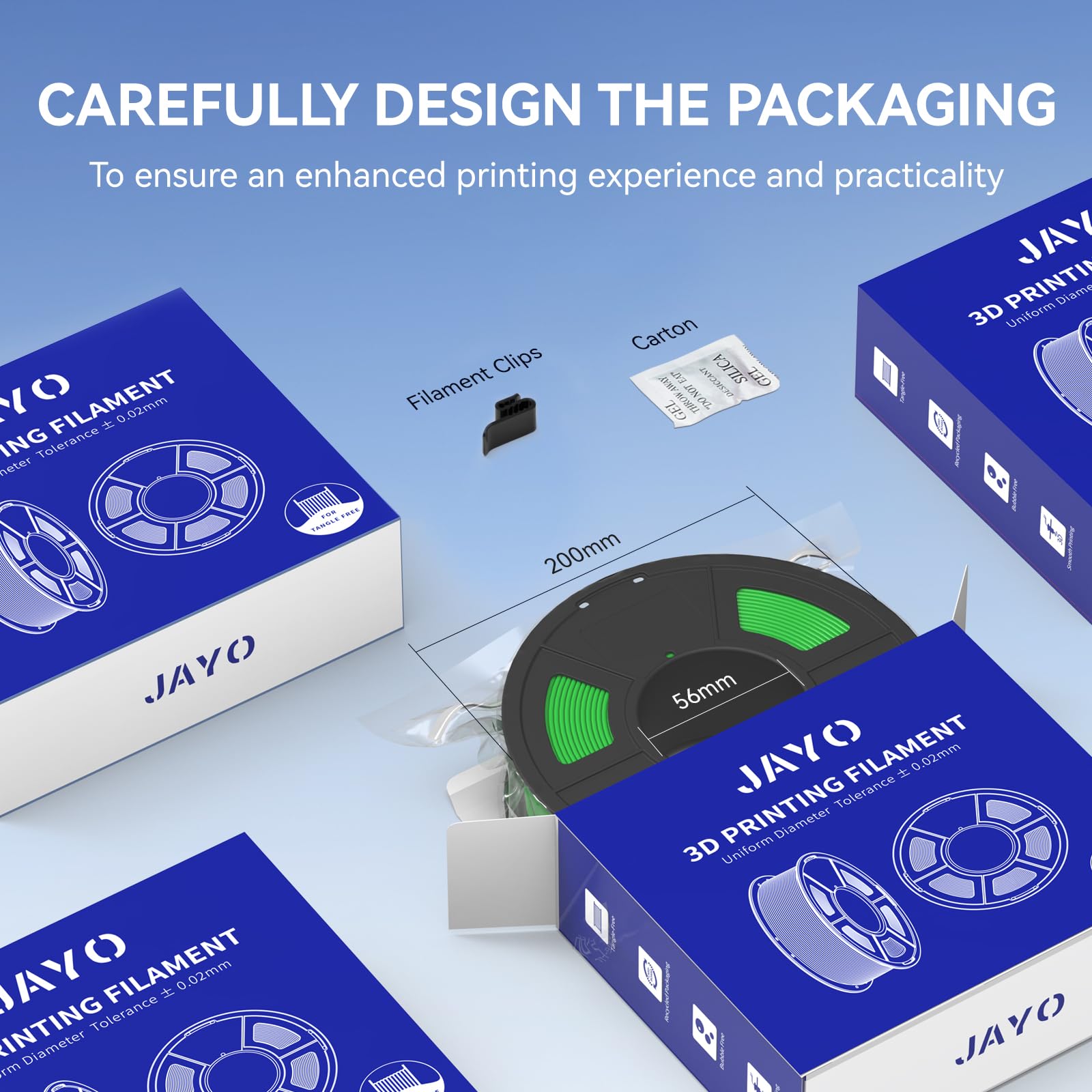 ["【JAYO Matte PLA 3D Printer Filament】In comparison to regular PLA 3D filament, matte PLA filament has a high-quality matte surface. The good layer adhesion and low shrinkage of matte PLA filament improve the printing result.","【Neatly wound filament】The JAYO 3D printer filament is neatly wound, preventing tangling during the printing process, reducing the risk of clogs and significantly increasing printing success.","【1.75mm filament diameter】JAYO PLA Matte 3D printer filament has a 1.75mm diameter, with a dimensional accuracy of +/- 0.03mm, making it suitable for almost all FDM 3D printers.","【Clog-Free & Bubble-Free】Matte PLA 1.75mm filament has better flowability, effectively reducing clogging during printing. The plastic vacuum packaging and desiccant make the filament less susceptible to moisture.","【Matte PLA Recommended Settings】We recommend printing the Matte PLA filament at a nozzle temperature of 210-230°C, bed temperature of 50-65°C, printing speed of 50-100mm/s."]