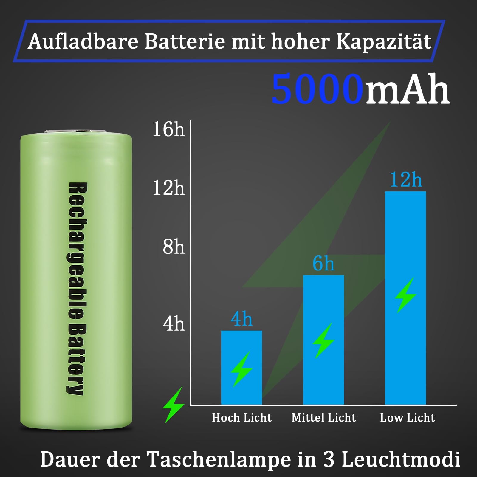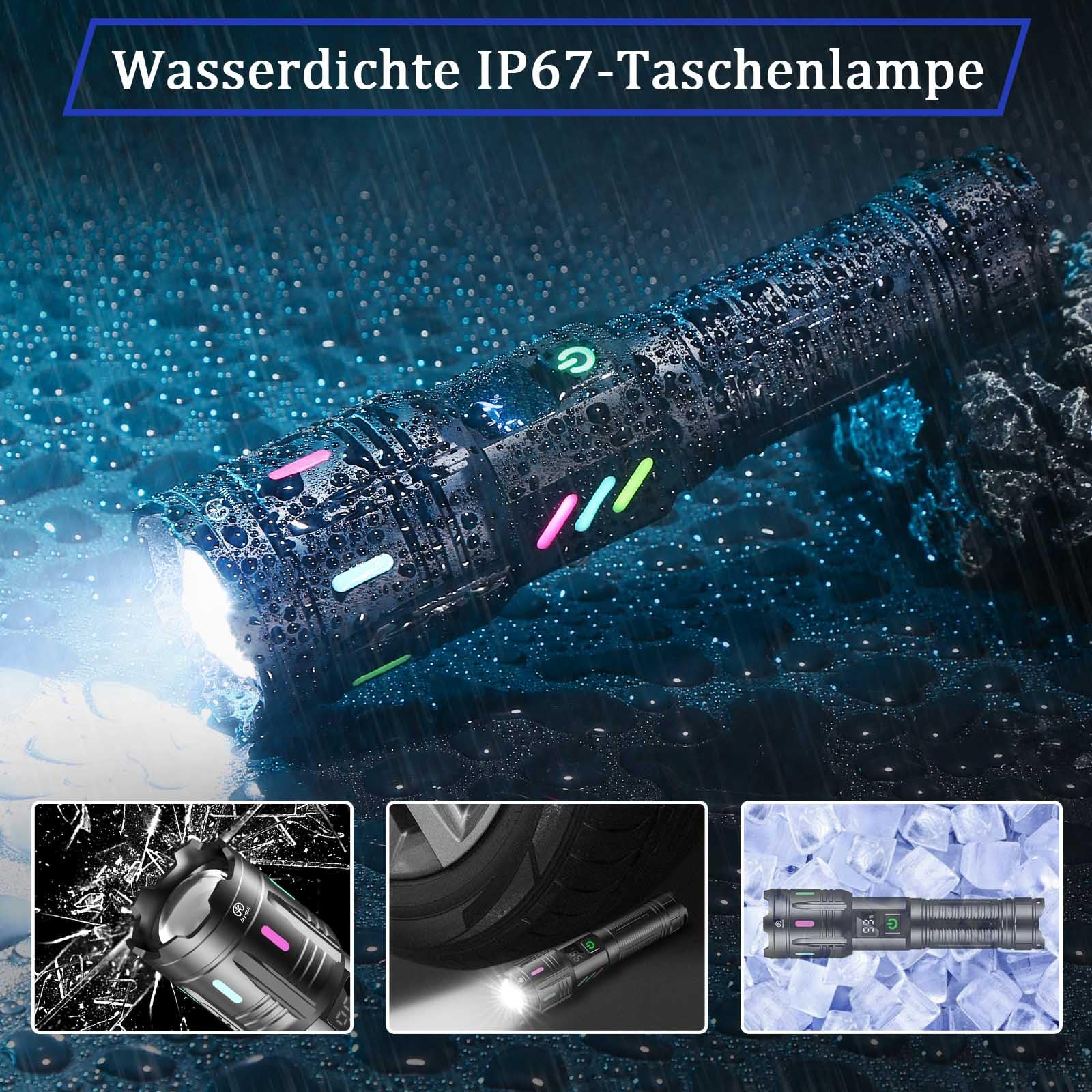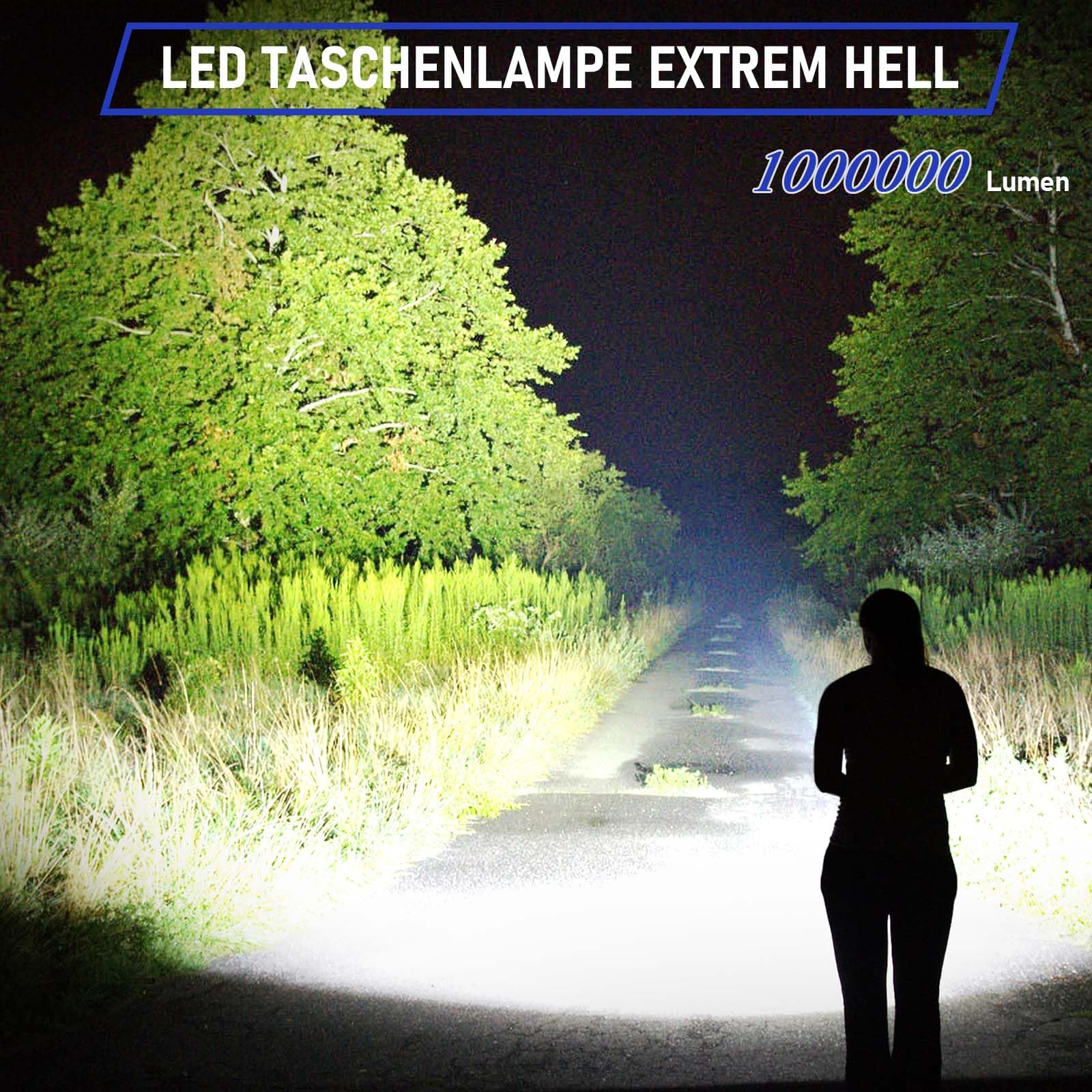 ["Extreme Brightness: With a whopping 1,000,000 lumens, this flashlight is extremely bright and illuminates large areas.","Multiple Light Modes: Five different light modes (High, Medium, Low, Strobe, SOS) provide the right lighting for every situation.","LCD Power Display and Cool Design: The digital power display can accurately show the charging and discharging status of the flashlight, and the cool design with fluorescent stripes makes the flashlight even more fun.","Rechargeable: Equipped with a rechargeable battery, can be charged via USB, 5000 mAh large battery to extend the flashlight's life span.","Zoom: Thanks to the adjustable zoom beam, the light beam can be tailored to your needs.","Durable Housing: The tough aluminum housing is water and shock resistant (IP67) and suitable for outdoor use."]