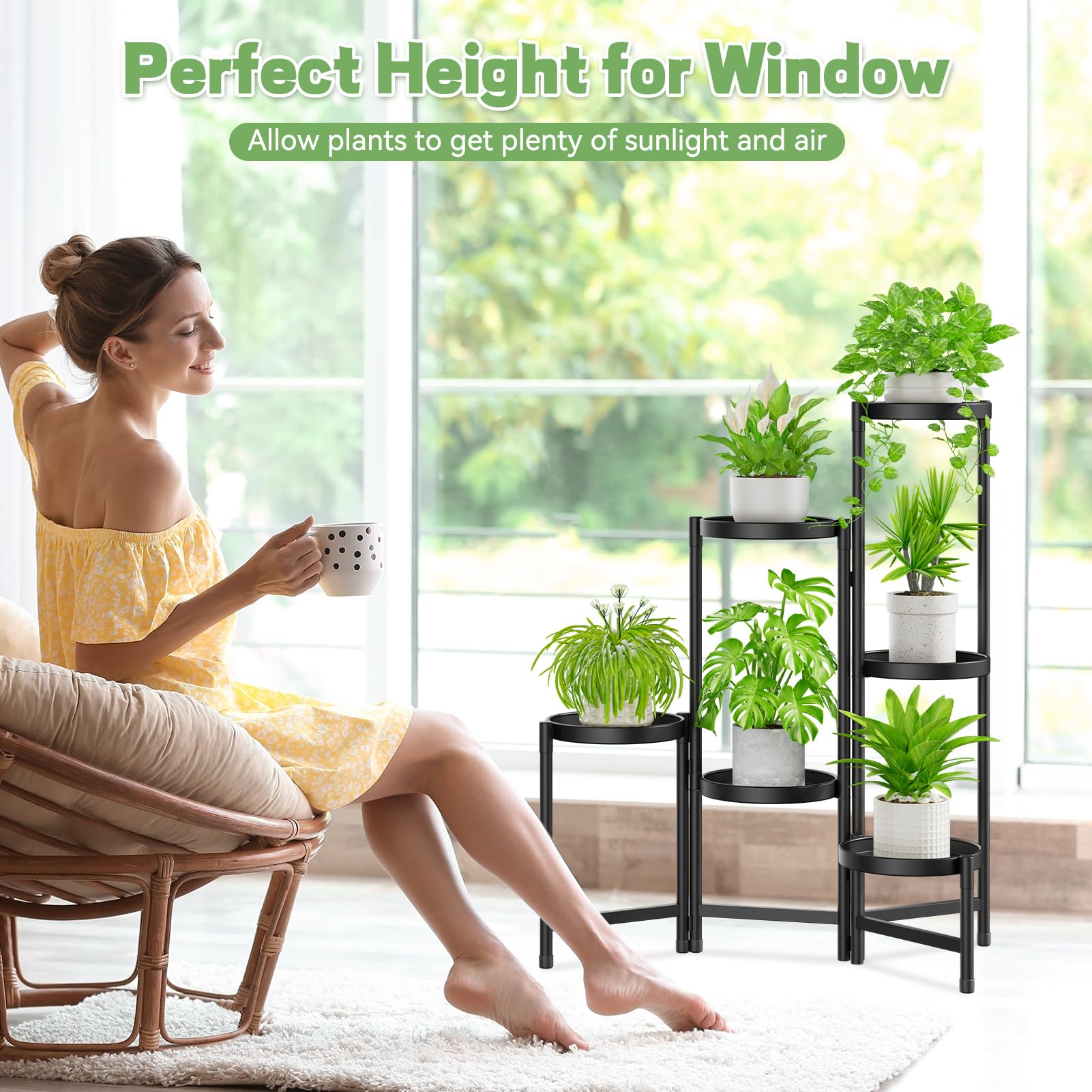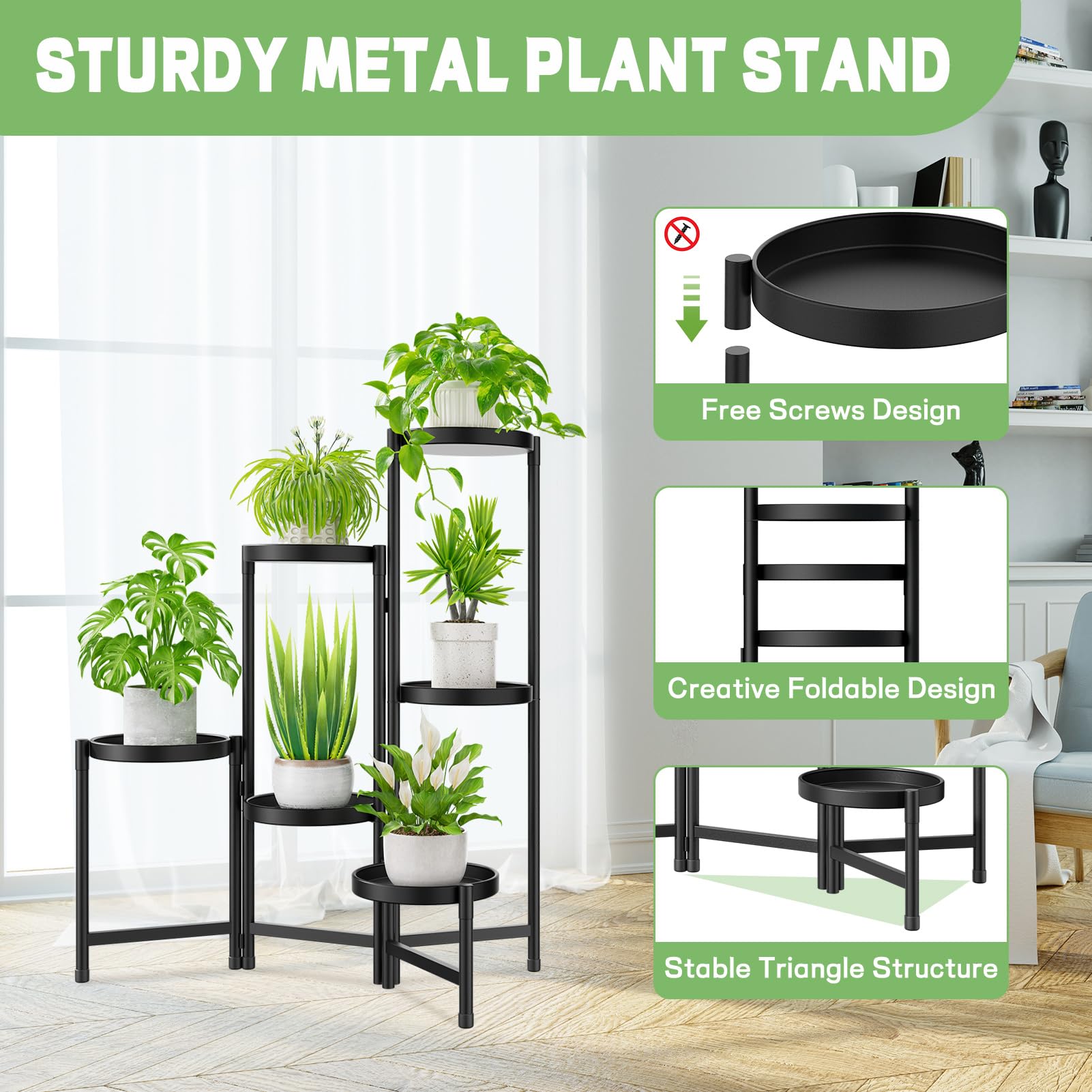 ["Sturdy Metal Plant Stand: Our 6-tier plant stand is made of durable iron with a well-polished powder coating to prevent oxidation and rust. This black plant shelf is perfect for indoor and outdoor use.","Perfect Height for Windows: Flower rack for indoor plants makes full use of every corner, the staggered plant trays are designed to keep plants off the ground to receive enough sunlight and air to promote plant growth.","Creative Foldable Design: The legs of the plant trays are hinged to the main legs in the middle, allowing you to fold it so that it can be flexibly adjusted to different styles to fit your space or adjust the placement of plants according to your preferences.","Attractive Flower Staircase: Our plant stand for indoor plants is designed to fit in small spaces, minimalist and elegant appearance adds a vibrant touch to your balcony, bedroom, living room, sofa corner, hallway, garden, patio.","Free Screw Design: Unlike traditional plant stands, our indoor plant rack has a screwless design, making it easy to assemble without tools. All you need to do is unfold it and cover it with 5 removable plant trays."]
