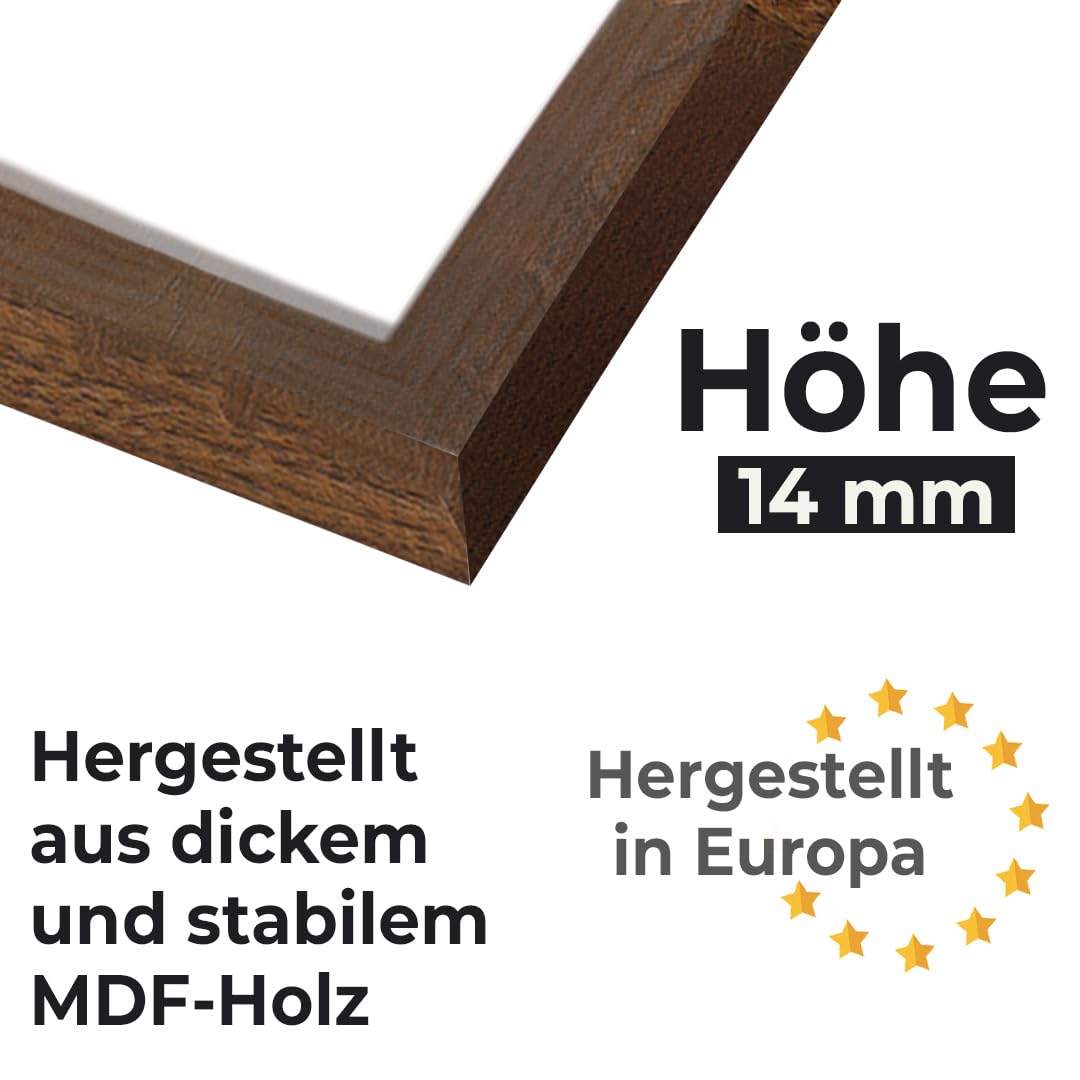 ["๐บ๐ธ European craftsmanship: Our frames are expertly handcrafted in Europe by master craftsmen with great attention to detail. Our quality control standards ensure that each frame not only brings your memories to life, but also adds finesse to your interior decor.","๐ Premium MDF Frame: Expertly crafted from high-quality, thick MDF wood with a depth of 0.71 inches and a width of 0.59 inches, ensuring exceptional durability and long-lasting quality. Our frames are made with shatterproof plexiglass to protect your precious memories. The reinforced back panel is equipped with additional clips to prevent the picture from slipping and provide extra protection.","๐ Frame Size: Our frame measures 15.75 x 19.68 inches, with outer dimensions of 16.89 x 20.83 inches, a profile width of 0.71 inches, a profile depth of 0.59 inches, and a weight of 1.98 lbs.","๐ผ๏ธ Versatile Display Options: With clips for vertical or horizontal placement, our frame offers versatility for any room and enhances your interior decor with its timeless beauty.","๐จ Elegant Walnut Finish: Our frames feature a stunning walnut color that seamlessly blends into any interior decor and adds an elegant touch. The durable color and finish provide vibrant color brilliance and allow for easy cleaning, ensuring their beauty lasts for a long time."]