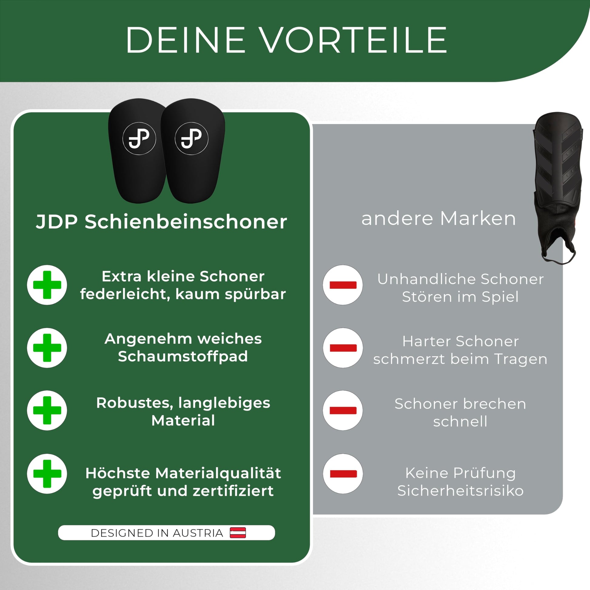 ["⚡ MAXIMUM PERFORMANCE: The JDP Mini Shin Guards are feather-light (0.49 and 0.77 oz), extremely thin (0.2 in), and barely noticeable thanks to their ergonomic design. The soccer shin guard set (2 pieces) fits like a second skin and is suitable for men, women, and children - from young to old.","🛡️ RELIABLE PROTECTION: Despite their small size, the Mini Shin Guards provide optimal protection against kicks, blows, and impacts. Many soccer professionals around the world already trust the Mini Shin Guards.","❤️ HIGH-QUALITY WEAR COMFORT: The extra Mini Shin Guards for children and adults adapt perfectly to the shin. Thanks to the soft foam padding on the inside, sticking to the skin is prevented - maximum wearing comfort included!","👪 PRACTICAL SIZE: The currently smallest shin guards on the market are available in two convenient sizes (3.9x2.4 and 4.7x3.1 in) in different colors. In addition to reliable protection, the soccer shin guards for men are also a hit in terms of appearance.","⭐ BEST MATERIAL QUALITY: The high-quality shin guards are made of a durable and long-lasting plastic material (100% PP material). The tested and certified guards combine comfort and functionality in one - onto the soccer field!"]