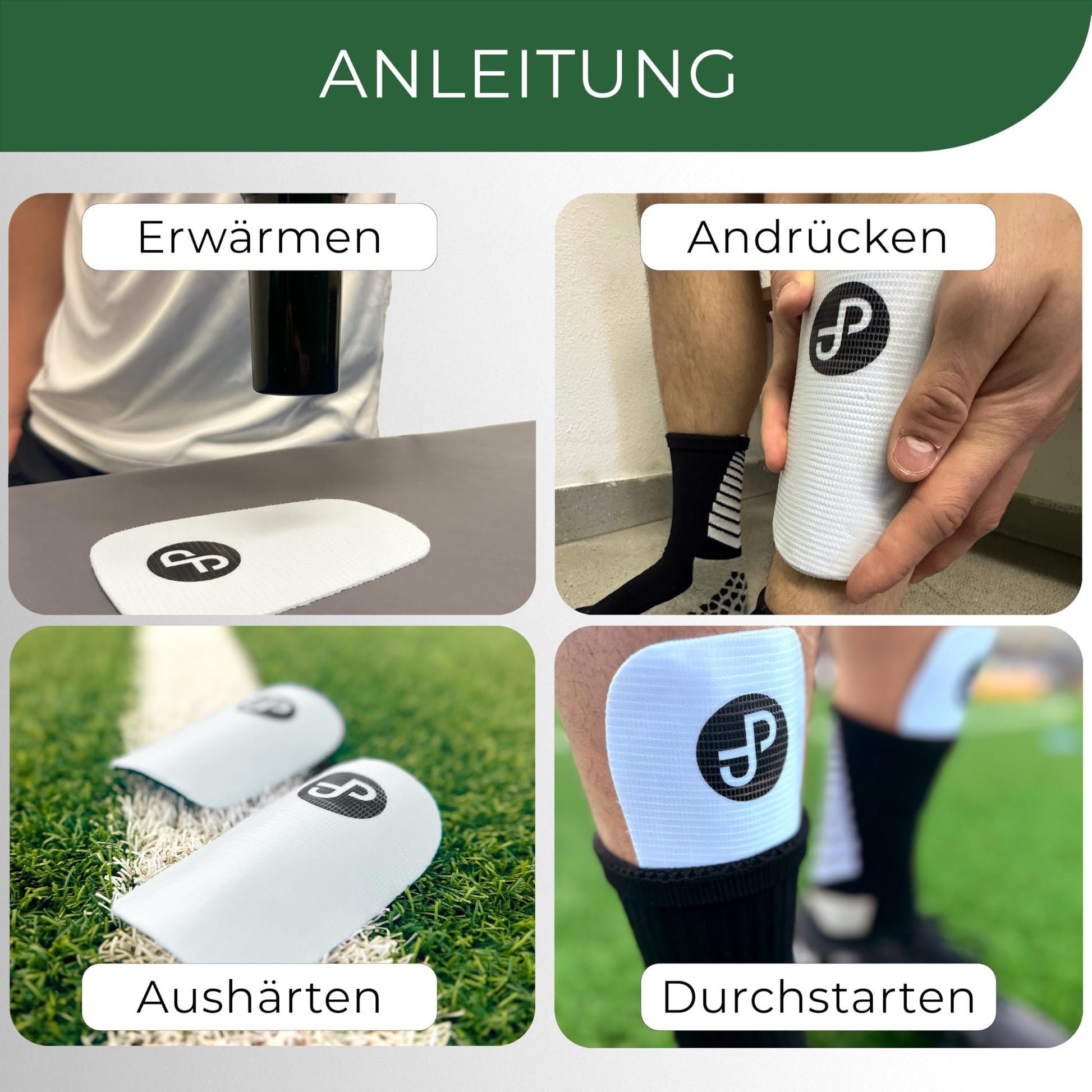 "⚽ Instructions: By briefly heating with a hairdryer, the JDP soccer shin guards become moldable and can be individually adjusted to the shin and musculature. Simply hold the mini shin guards on the shin and allow to harden. And off you go - onto the soccer field!"]
