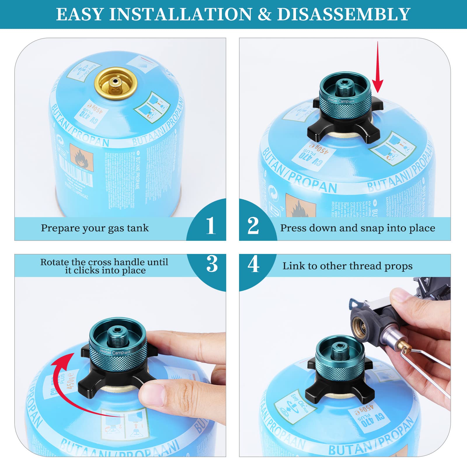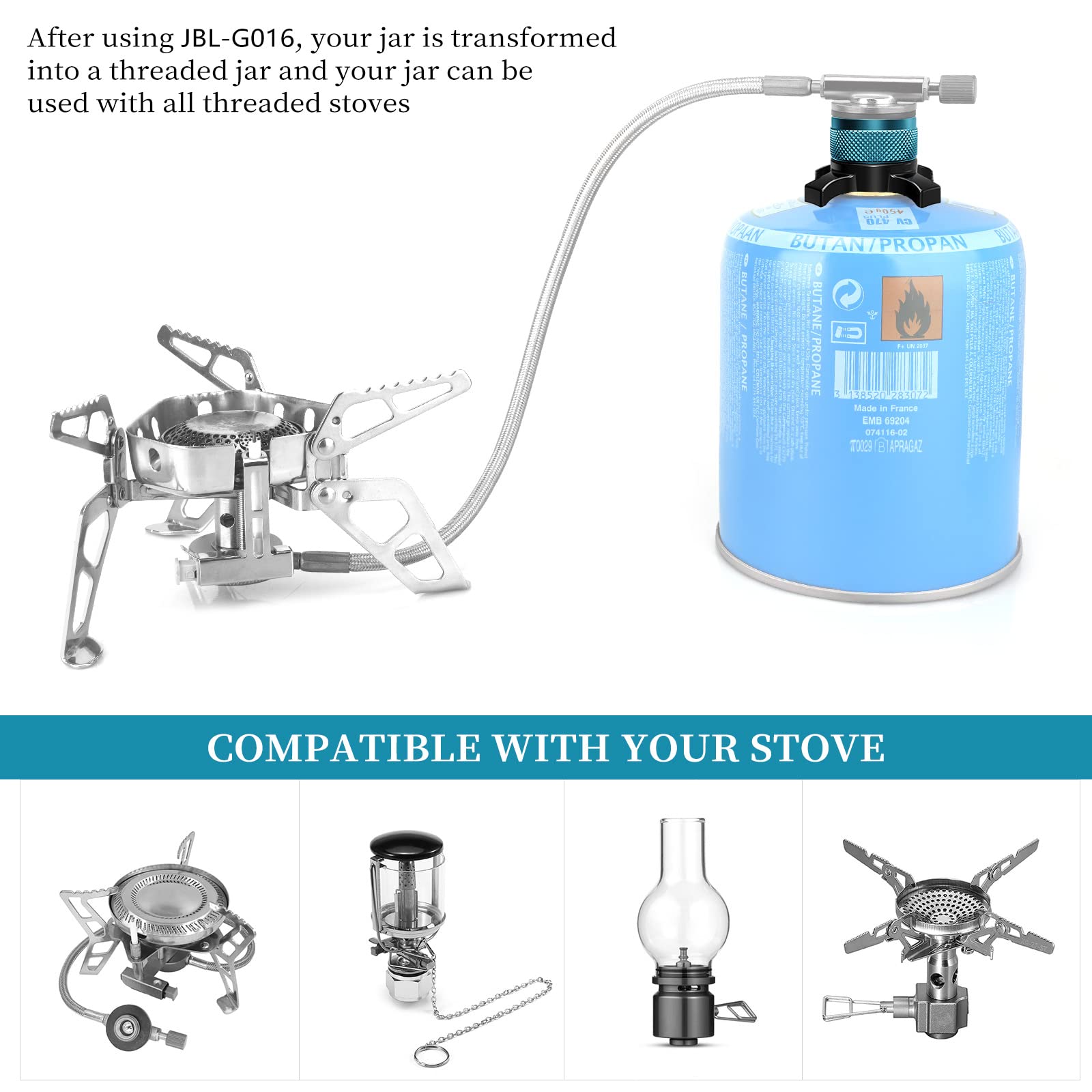 ["Conversion in one step"] Instant conversion once installed. This allows all stoves/burners/heaters/lanterns of the Standard EN417 type designed for 7/16" threaded gas canisters to be attached immediately to a bayonet closure gas cartridge. Compatible with stoves from brands like Primus, Jetboil, Optimus, Msr, Soto, Kovea, Coleman, Fire Maple, 360°, GSI, etc.