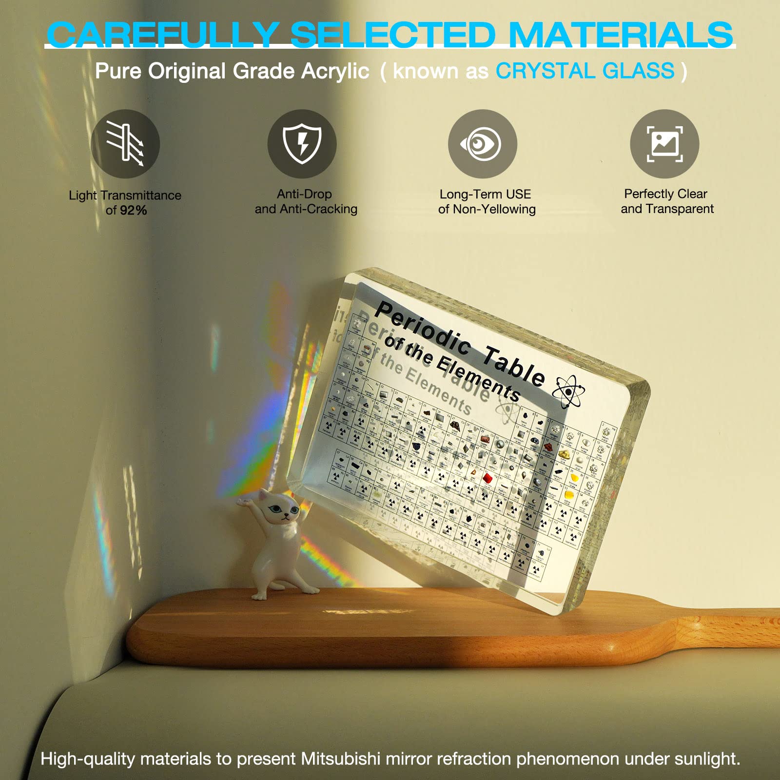 ["⚛️🎓Samples of 83 real elements Each element samples in the Jeebel Periodic Table are professionally cut, processed, melted, and sealed. All elements are safe and present in them in the form of simple substances and stable compounds. Intuitive representation of each element creates a visual memory that not only increases children's interest in learning, but also deepens their understanding and memory of the chemical elements.","💡✨Creative Crystal Table Lamp Crystal appearance combined with diamond-cut design, then projected through colored light, intuitively refract real elements immediately rich colors, sparkling and dancing diamond-like light, making this scientific prop instantly a night light to brighten life. With 7 color variations, 4 modes (static/jump/mixed color/xuancai) and adjustable brightness, you can freely choose the corresponding light modes & brightness.","👀😆Easy to Read Jeebel Periodic Table of real elements is made of high transparent crystal adhesive grade A acrylic, safe, high light transmittance and pure color without yellowing. The customized printing process ensures smooth lines and a clear, clean handwriting for easy identification. A clear, easy-to-read and comfortable reading material not only brings joy to the eyes, but also arouses children's curiosity to explore.","🔎🏫Loved by Science Enthusiasts Periodic table acrylic such a unique presentation, the elements have so much detail and \"wow factor\", you will wonder, \"How is the earth made up of all these things?\" It is the perfect gift that science or chemistry enthusiasts cannot resist, the perfect tool to help children learn about science, and a transformative ambient light that relieves study stress and relaxes the brain.","📦👍Enjoy Learning Anytime Periodic Table Real Elements size is 6.68x4.72x0.94inch, is small and convenient. You can use it not only in the classroom, laboratory, or at home, but also tuck it into your school bag to have it on hand for studying and researching anytime. Introduce chemical elements in an easy-to-understand way to promote interaction between parents and children and discussions in the family for learning and researching."]