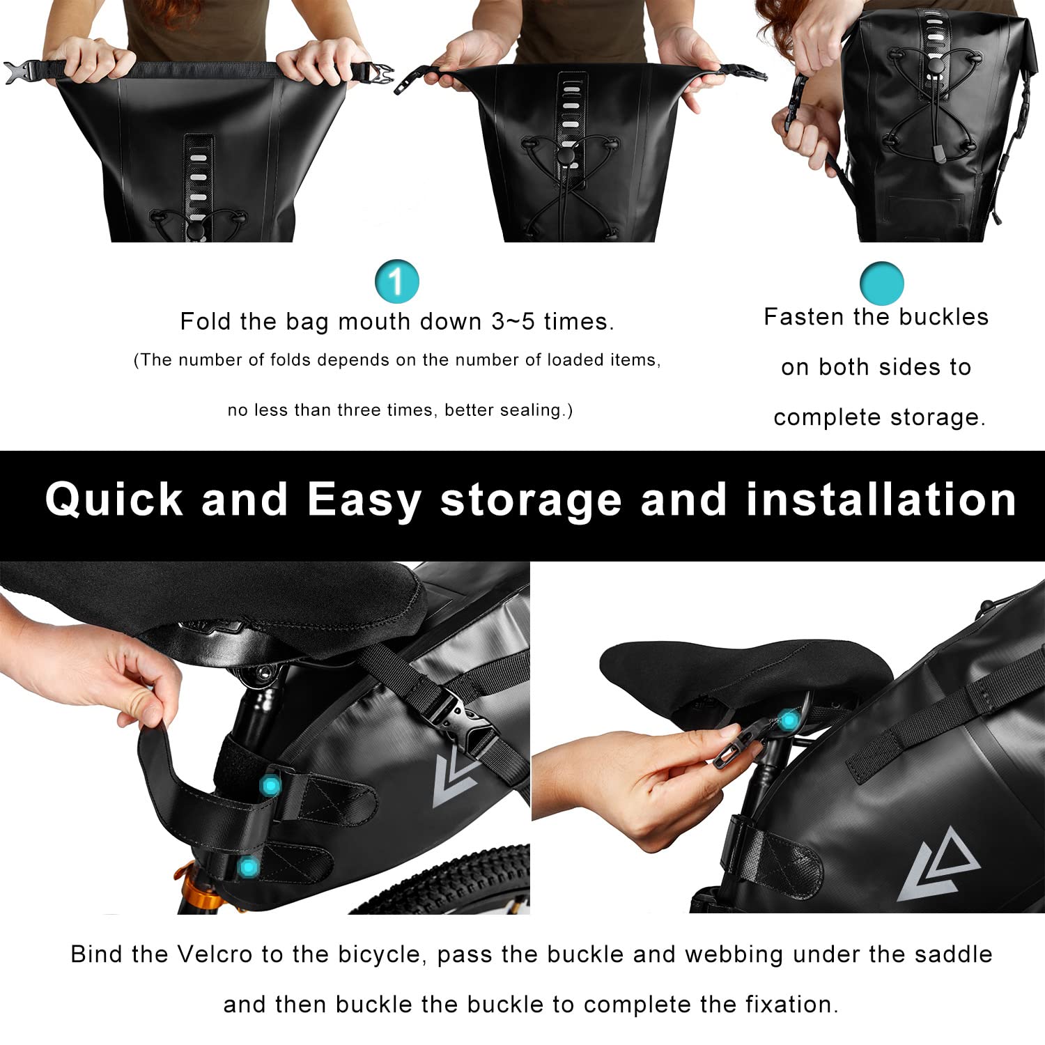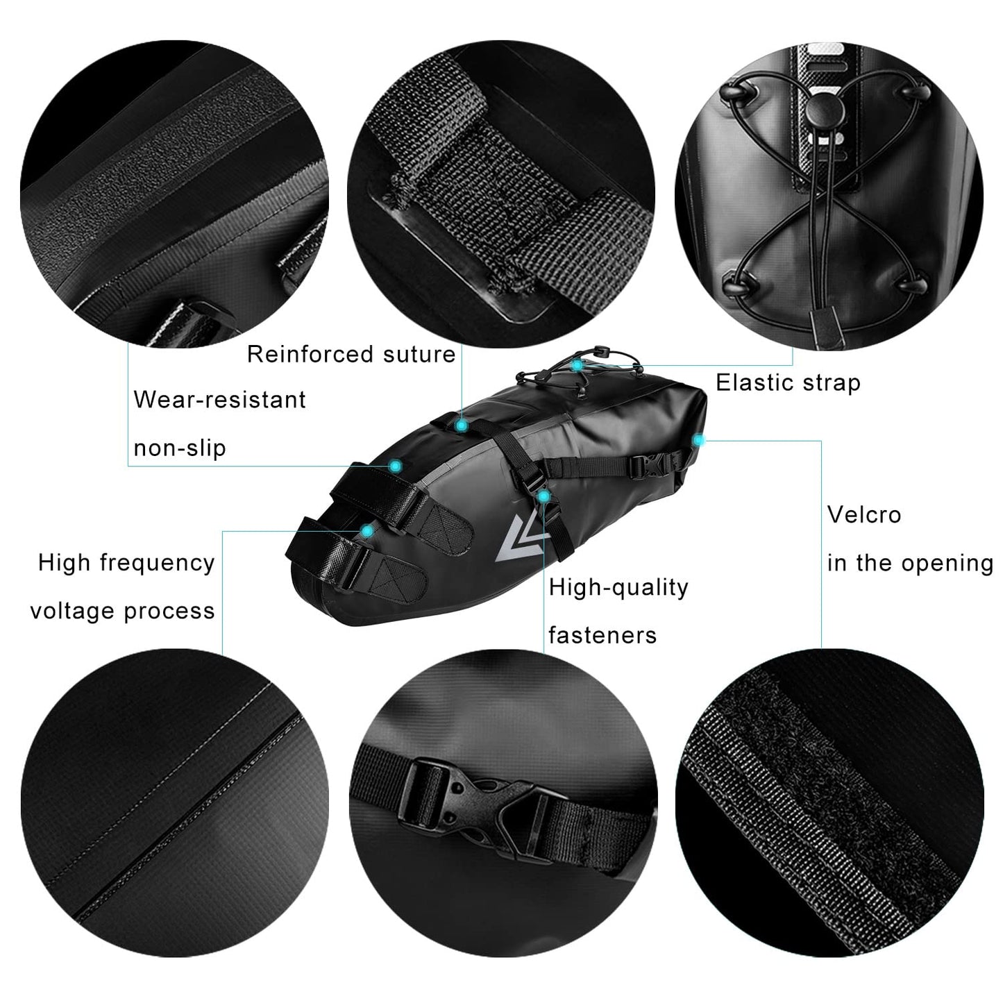 ["Innovative bike bag - The BackLoader is a large saddle bag, capacity can be adjusted from 3L to 10L, can be attached to saddle rails and seat post without the need for a rack, and also functions as a fender.","Waterproof bike bag - Made of 500D PVC Waterproof Tarpaulin, providing the best waterproof performance. Cold-resistant, aging-resistant, durable, and easy to clean.","Tail light interface & Reflective logo - A tail light can be attached to the back of this saddle bag. Reflective strips and reflective logo are attached on both sides of the bag to ensure safe night riding.","Easy to Install - Velcro straps and buckles are convenient for installation and unloading. The improved saddle mounting system with compression straps reduces swaying associated with large rear loads. The bag is aligned with the bike axis, ensuring weight distribution is always centered.","Convenient and Comfortable - Outside the bag, there is a rubber band where you can attach your pump, helmet, and anything else you need. Suitable for a variety of bikes and outdoor cycling, such as MTB, mountain bikes, folding bikes, and road bikes. Note: Do not pack it too full, otherwise it may not close properly."]