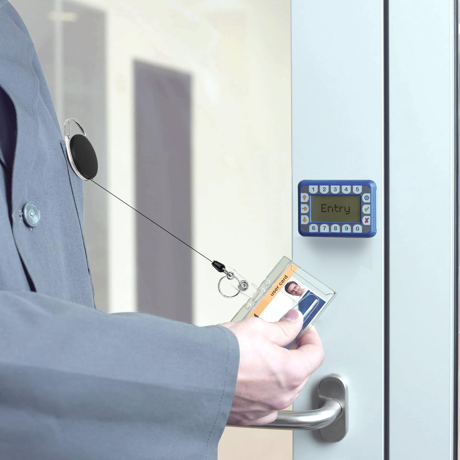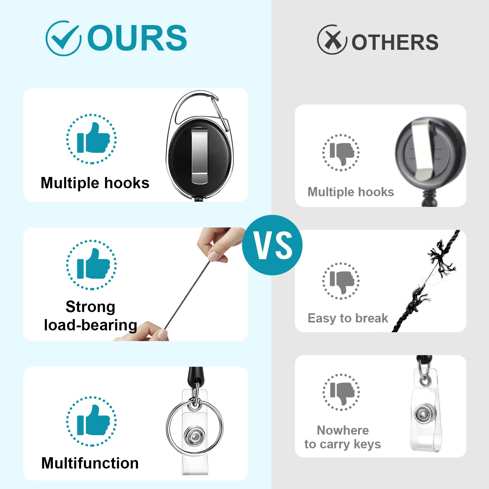 ["Multifunctional】The retractable keychain is equipped with a carabiner hook and a pocket clip. The carabiner hook can easily be attached to a backpack, and the pocket clip can be hung on the edge of a shirt pocket, making the ID holder more convenient to use.","Rich accessories】The key ring and plastic buckle of the badge holder are cleverly integrated underneath. The plastic buckle adjusts to various shapes of badge holders, while the key ring can easily hang keys, bottle openers, etc.","Convenient operation】The retractable ID badge holder comes with a 63 cm long, 1 mm thick retractable keychain. With just a gentle pull, you can easily remove and place various items hanging on the keychain.","Sturdy material】The retractable keychain is carefully crafted from high-quality hard plastic, a zinc alloy, and elastic nylon bands to ensure that the retractable keychain is durable and keys or ID holders are not easily lost.","Widely used】The key reel is suitable for teachers, nurses, police officers, students, office workers, etc. to store work badges, and is also suitable for outdoor enthusiasts to carry small tools."]