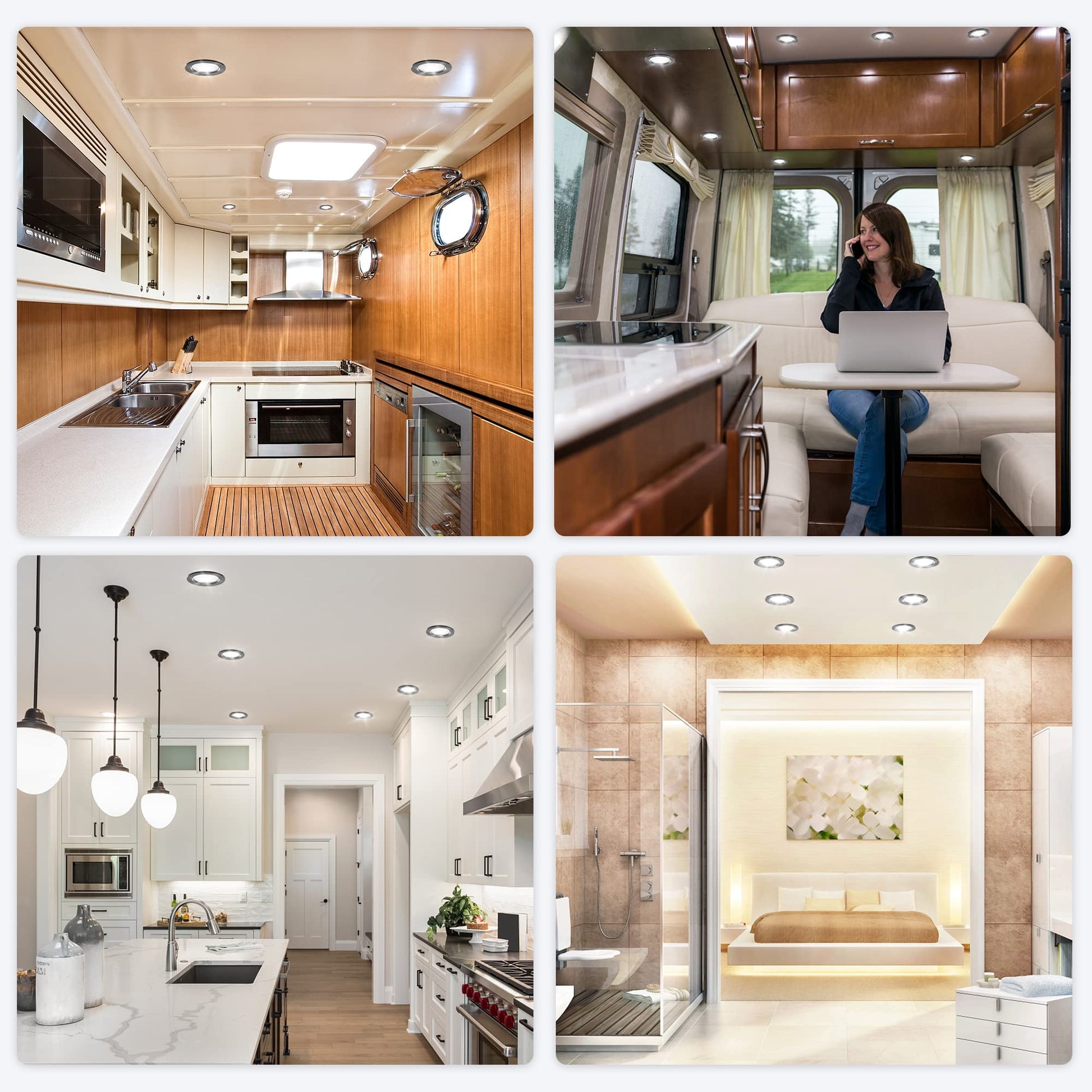 ["Durability: Made from a full aluminum shell, ultra-thin and lightweight, with good heat dissipation that can effectively extend the lifespan of RV lights. LEDs consume about 80% less energy than incandescent bulbs, half as much as compact fluorescent lamps, and have the same or higher light output.","Wide range of applications: It can be used for interior lighting purposes such as various RVs, yachts, cars, boats, trucks, trailers, buses, and cabinets.","Easy to install: The recessed mount requires no screws and snaps into the hole once the mount is attached. Ceiling recessed light with a clear and clean appearance, elegant and modern.","Dimmable: 4 * 240lm dimmable, 4000K natural light, suitable for RVs with DC 12V power supply. Household power is AC 110-230V, you need a DC12V power supply to operate them for home use. (without transformer)","Package: Includes 6 * 12V LED recessed lights, 10 * wiring caps, 1 * user manual. We provide friendly customer service. If you have any problems with the product, feel free to contact us. We will respond within 24 hours."]