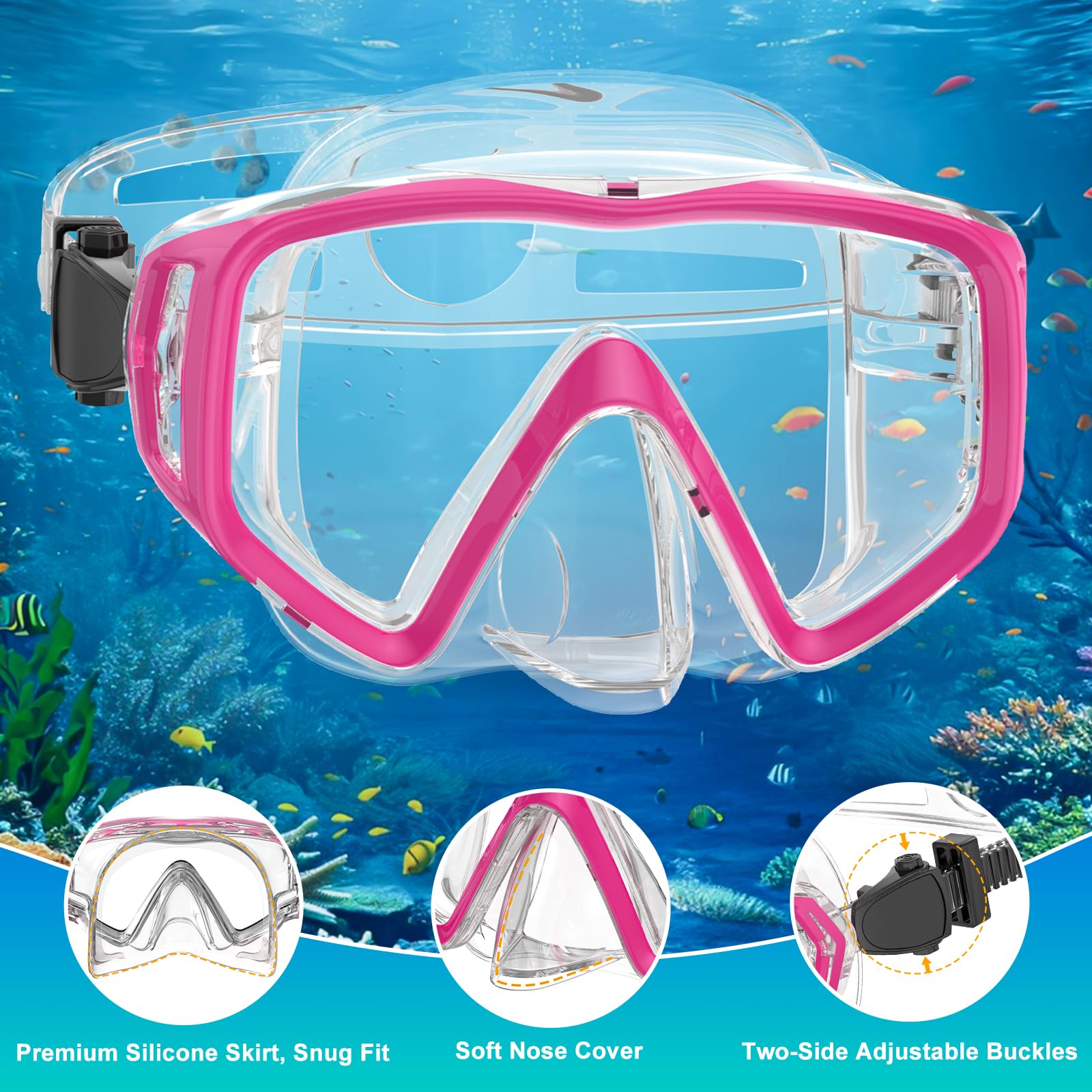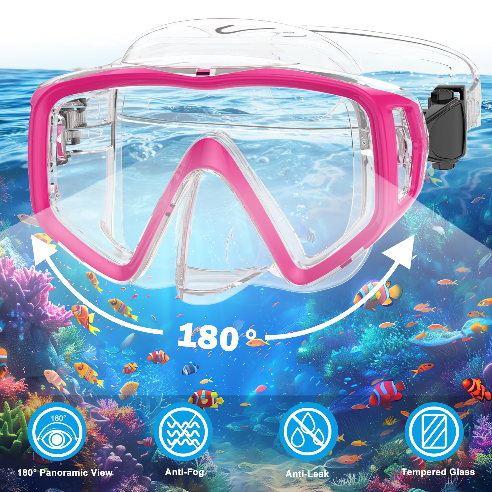 ["ANTI-FOG TOUGHENED GLASS SNORKEL MASK: The snorkel diving mask features a tempered glass lens with 180° panoramic view for snorkeling, swimming, and diving. Diving mask with ergonomic design for maximum fit with different face shapes, more comfortable wearing, and stronger seal; The skirt is made of soft, liquid, transparent food-grade silicone providing ultra-visibility. You will have a crystal clear underwater experience!","EASY BREATHING & FOLDABLE DRY TOP SNORKEL: Our adult snorkel package comes with a fully dry snorkel that allows air to enter when surfacing and automatically blocks to prevent water from entering the snorkel when you are below the waterline. The purge valve allows for easy clearing and draining of water from the snorkel, making snorkeling more fun, safe, and easy!","FOOD-GRADE SILICONE MATERIAL: JEMULICE adult snorkel sets are made of soft food-grade silicone which is very comfortable, safe, and durable. The food-grade silicone mouthpiece fits comfortably in the mouth, allowing for extended use without discomfort. No jaw fatigue and no strange odors, safe for the skin, especially for people with sensitive skin! Perfect diving equipment for adults and teenagers!","QUICK ADJUSTMENT SYSTEM: The diving snorkel mask is equipped with a quick adjustment system that allows you to quickly and easily adjust your mask to get a perfect fit. Adjustable strap that can be customized to fit any face shape; The snorkel's detachable buckle with quick release allows for easy separation and connection of the mask and snorkel with a single push or pull, making operation more convenient!","MAKE IT MORE FUN, SAFER AND EASIER: Our dry snorkel set is fully tested and perfect for snorkeling, diving, and swimming! It includes a mask, a snorkel, a pair of soft silicone earplugs, and a sturdy mesh bag. You can store all your snorkeling gear in the mesh bag. ~ Customers are our top priority and we are happy to replace any defective products!"]