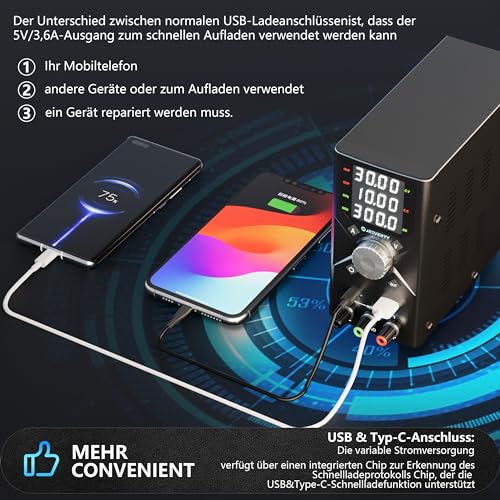 ["1️⃣【New Style and Encoder Button】: The newly designed Jesverty SPS-X series bench power supply is unlike any other traditionally looking products you have ever experienced. With the central encoder adjustment knob, you can adjust both your voltage and current digit by digit according to your desires!! (Adjustment resolution 0.01 V/0.001 A).","2️⃣【Output ON/OFF Control】: With a single press of the output control button, you can easily turn the output ON/OFF. No need to remove the load or switch off the power every time you want to adjust settings!!","3️⃣【USB-A and USB-C Quick Charge】: The Jesverty SPS-X series features two Type A and Type C charging ports, both supporting 20W quick charge⚡. Convenient for charging your smartphone and powering your Arduino UNO, Raspberry Pi, or other electronic modules for your projects.","4️⃣【4-digit Display and Power Calculation】: The Jesverty bench power supply has a large, bright 4-digit LED display showing real-time measurements of V/A/W output by the device. Display resolution is up to 0.01 V, 0.001 A, and 0.1 W. You can also adjust the screen brightness by rotating the central buttons when the output is off, making it easier to see in dark environments.","5️⃣【Features and Protection】: AC110V/220V switchable input, adjustable OCP overcurrent protection, fixed OVP overvoltage protection, temperature-controlled fan, OPN* output status setting, screen brightness adjustment, low power consumption sleep mode, etc. All practical functions are included in this tiny device!!","6️⃣【Compact and Lightweight】: The Jesverty SPS-X adjustable power supply is even more compact, measuring only 7.28 (L) x 3.35 (W) x 6.29 (H) inches and weighing around 2.5 pounds, greatly saving valuable space on your workbench. Perfect for applications like labs, educational institutions, factory production testing, maintenance repairs, battery charging, anodizing, DIY electronic projects, etc.","7️⃣【Items You Get & Customer Service】: 1 x SPS-X unit, 1 x power cord*, 1 set of test leads*, 1 x user manual (contact information included in the package). We offer professional technical support. If you have any problems or questions regarding your order, feel free to reach out to Jesverty Customer Service through Amazon or email.","🌟Note: OPN is a feature that allows the device to output voltage and current once you turn on the power switch without needing to press the "OUTPUT" button.","🌟Note: Power cord and AC input settings may vary depending on the product destination during factory shipment.","🌟Note: Test leads included with the device are just a gift. We recommend preparing test leads with sufficient current capacity if your project requires long-term use of high current."]
