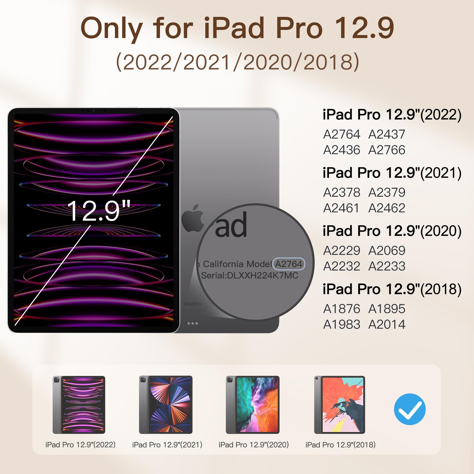 ["Developed for iPad Pro 12.9 inch (6th/5th/4th/3rd generation, model 2022/2021/2020/2018, NOT for 1st/2nd generation, model 2015/2017). Compatible with iPad models: A2436 A2764 A2437 A2766 A2378 A2379 A2461 A2462 A2229 A2069 A2232 A2233 A1876 A2014 A1895 A1983 kg. Please check the bottom of your iPad to find the model number","Made of PU leather exterior and microfiber interior. Durable material provides reliable protection for your device's body","Slim and lightweight design supports magnetic attachment and wireless charging. Easy access to all controls and features","Magnetic Smart Case supports automatic Sleep/Wake function. Strong magnetic adsorption ensures your device is securely and easily attached","The triple-fold front cover offers two standing positions for viewing and typing"]