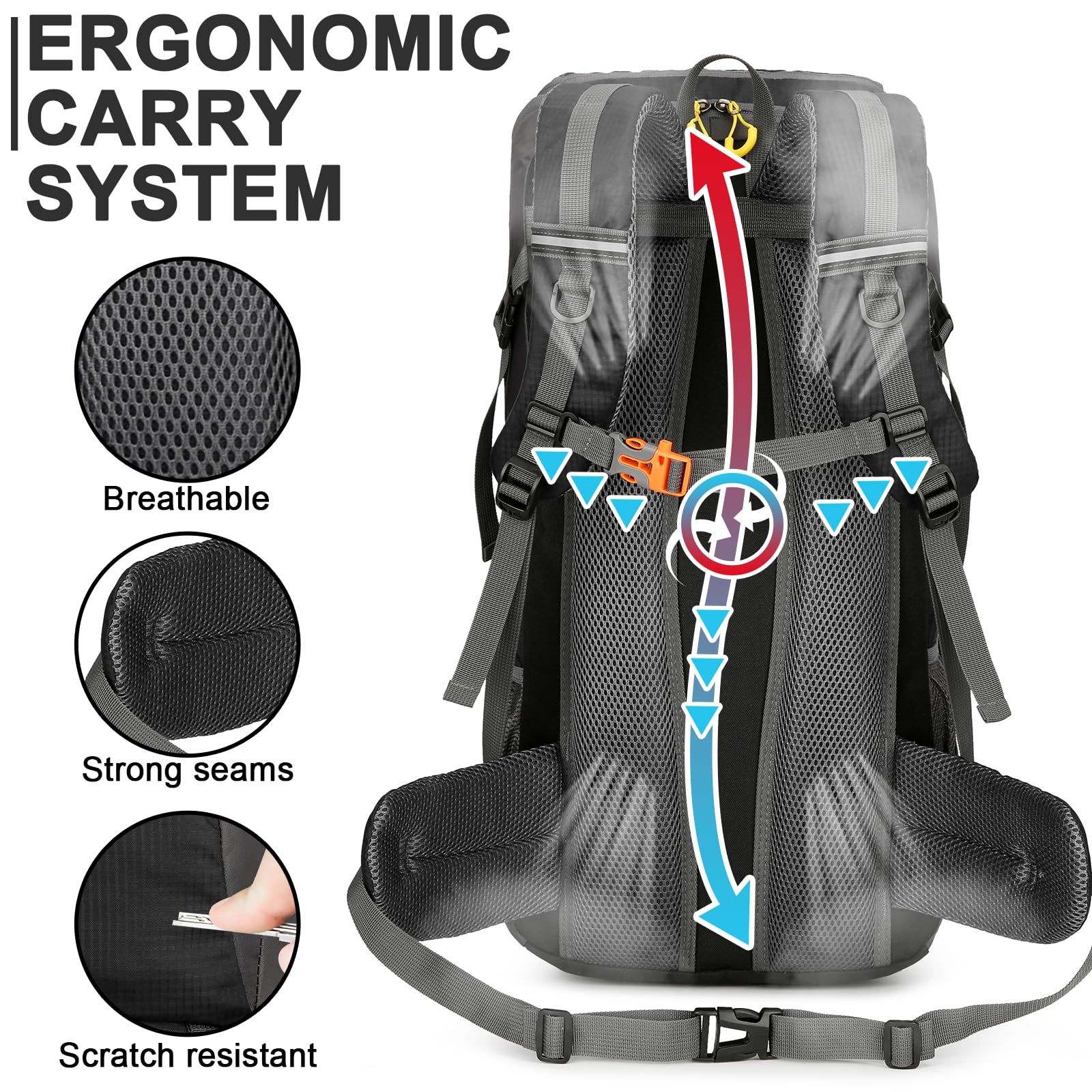 ["Trekking Backpack 50 liters Our travel backpack with rain protection measures 62 x 30 x 15 cm (23.6 x 11.8 x 5.9 inches). With a capacity of 50 liters, but weighing only 0.69 kg, it is ultra light enough for 3-5 days of travel or outdoor adventures, camping, trekking, sports, and mountaineering.","No Internal Frame Backpacker backpack 50l thickened padded backrest, adjustable shoulders, ergonomic design, relaxed and breathable, with ample foam padding to relieve the strain on your shoulders. Labor-saving and durable. The reflective stripe design on the shoulder straps and on the trekking backpack allows for visibility in the dark and features a first aid whistle on the chest strap to ensure your safety outdoors.","Rain Cover Our backpacking backpack 50l is made of high-quality tear-resistant polyester and nylon fabric, tear-resistant, scratch-resistant, and wear-resistant. It comes with an additional waterproof rain cover on the bottom pocket to prevent water and dust from entering the backpack.","Multifunctional Design In the inner layer of our backpack, mobile phones and valuables can be stored. On the side of the hiking backpack, there are adjustable rubber bands and mesh pockets as an external hanging system. The travel hiking backpack provides space for large equipment such as trekking poles, sleeping bags, hammocks, and other gear items.","Travel If you don't have a suitcase, choose this one. Of course, it was a great success for you, it looks trendy and has this street look as it held much of your clothing and you found it to be sturdy and comfortable without being bulky. It looks cool and is at the same time stylish and comfortable. You will absolutely love it and feel secure now when traveling with it. It gives you a sense of freedom and style!"]