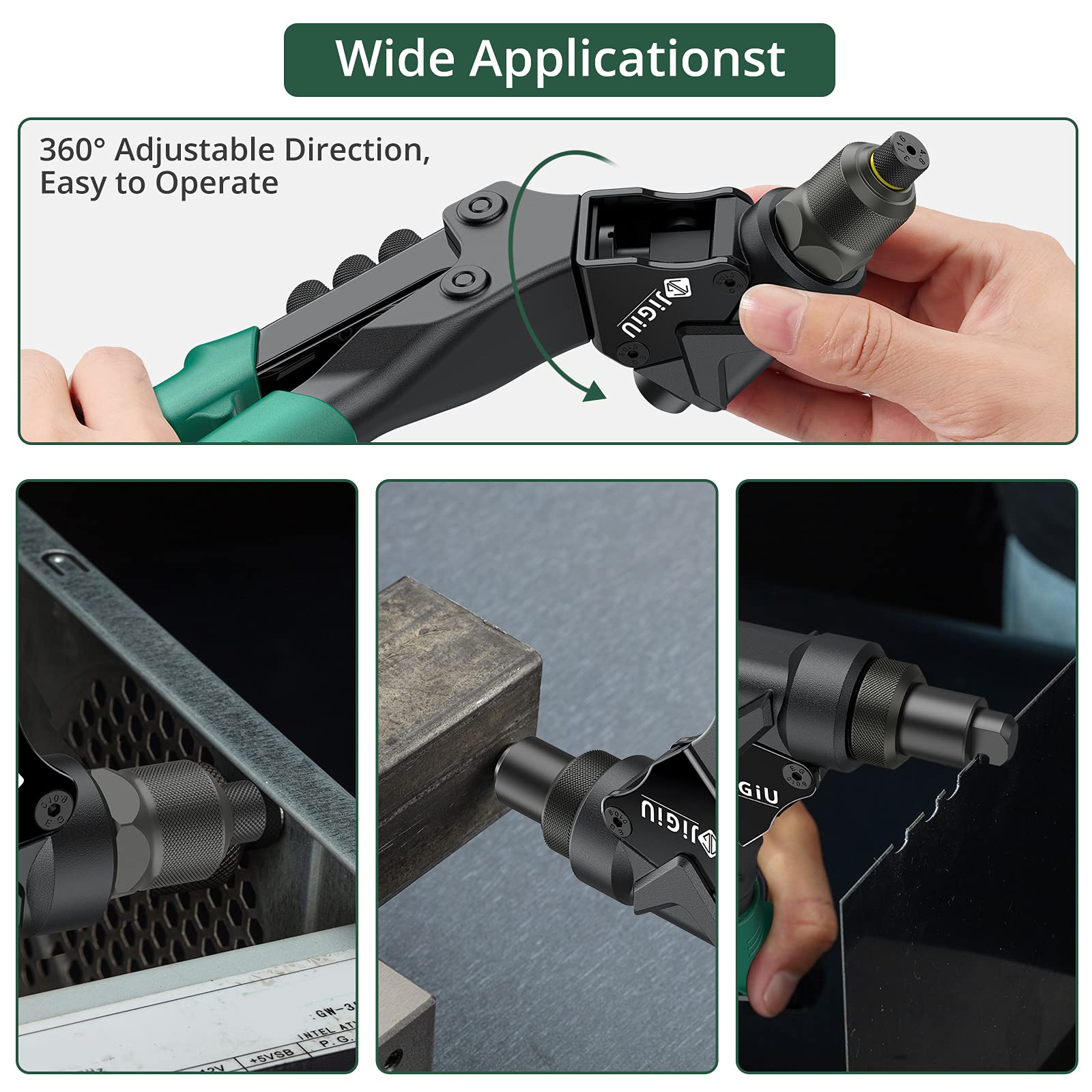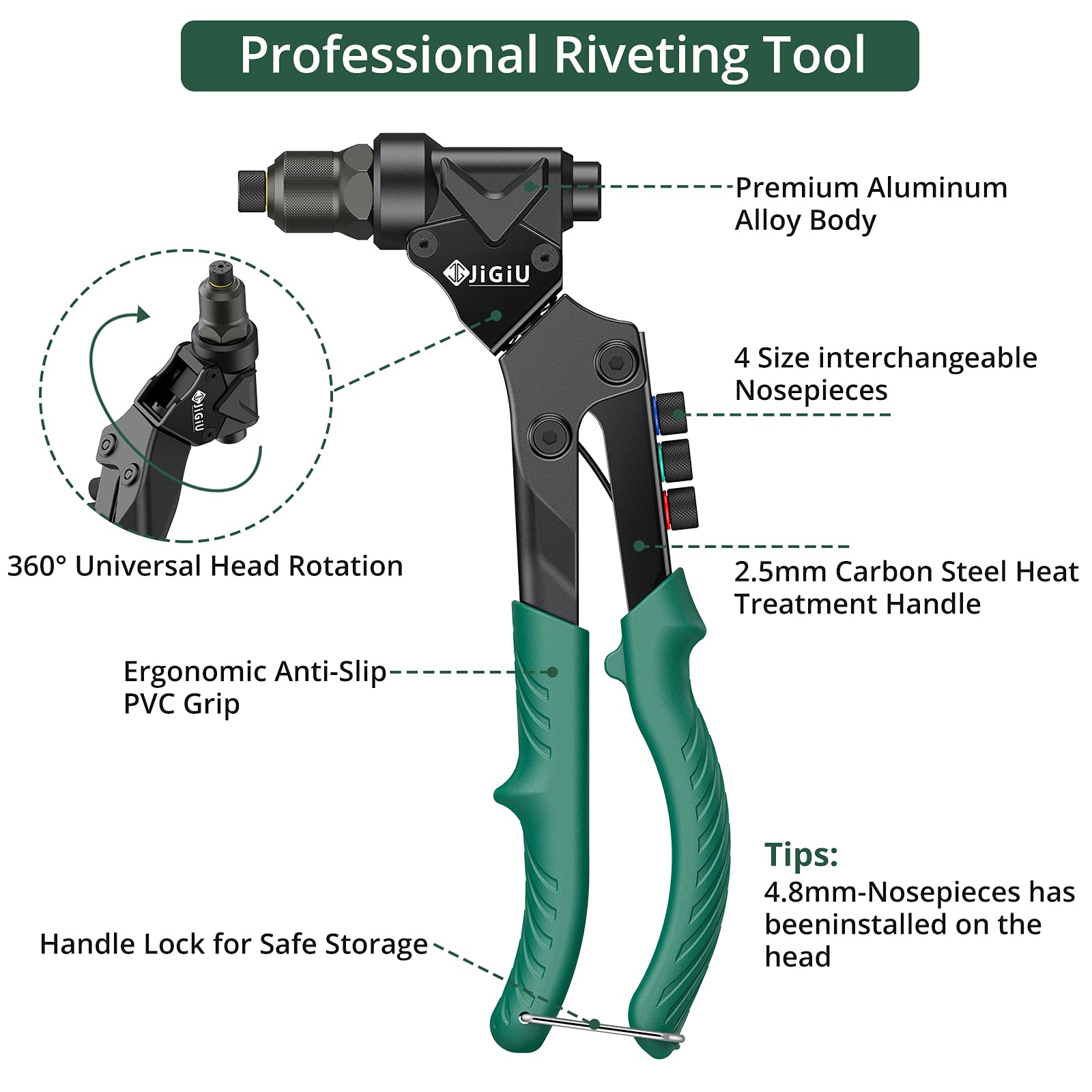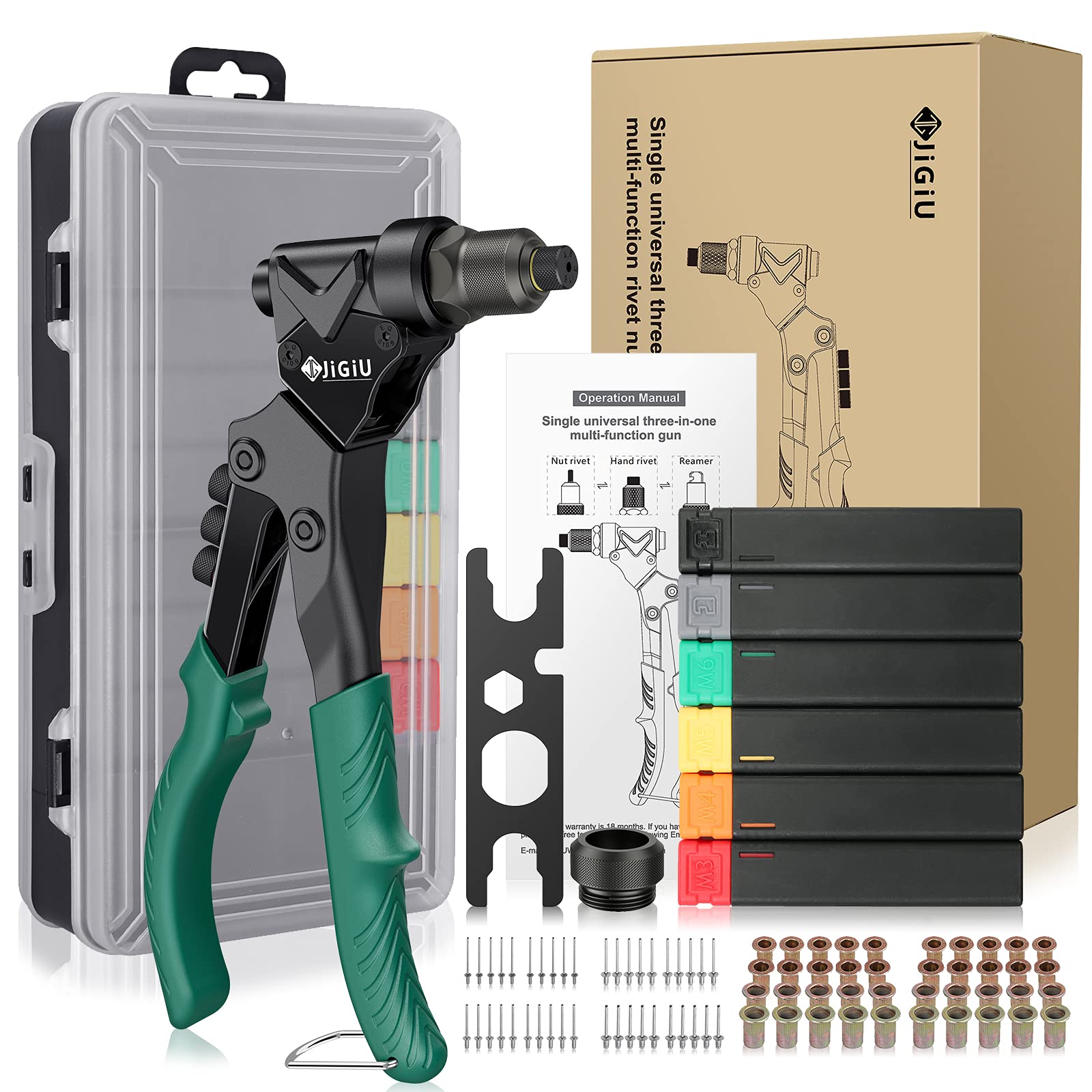["【3 IN 1 Rivet Gun Rivet Nut Tool Set】 Practical rivet tool set, Three functions integrated: rivet gun, rivet nut tool, and reaming tools. 4 interchangeable nose pieces including: 2.4mm(3/32"), 3.2mm(1/8"), 4mm(5/32"), 4.8mm(3/16") and metric M3 M4 M5 M6 are labeled in colored containers with corresponding size.","【360º Swivel Head Design】 JiGiU rivet gun, with improved 360° swivel rivet head, suitable for working in tight spaces and hard-to-reach areas. It will make riveting work more convenient. (Note: For safe operation, please wear professional work gloves)","【Comprehensive Accessories with Rivets and Nuts】 40 pieces rivets (2.4mm *10pcs, 3.2mm * 10pcs, 4.0mm *10pcs, 4.8mm * 10pcs) and 40 pieces nuts (M3 *10pcs, M4 *10pcs, M5 *10pcs, M6 *10pcs) ❤ATTENTION: ①4.8mm rivet head & M6 mandrel is NOT recommended for use with steel and stainless steel rivets. ②Applicable sheet thickness for reaming: Stainless steel≤1mm, Aluminum≤3mm, Galvanized sheet≤2mm❤","【Ergonomic Design】 JiGiU rivet nut tool has a high-quality, lightweight aluminum alloy housing and the handle is made of 2.5mm thickened reinforced carbon steel with heat treatment, protecting against corrosion and durable. Ergonomic design with curved handle with PVC sleeve, non-slip and easy to grip.","【Practical Storage Box】 All rivet tools and accessories are packed in a sturdy, compact carrying case for easy storage and portability. Each accessory tool is placed in its position to remain neat and tidy."]
