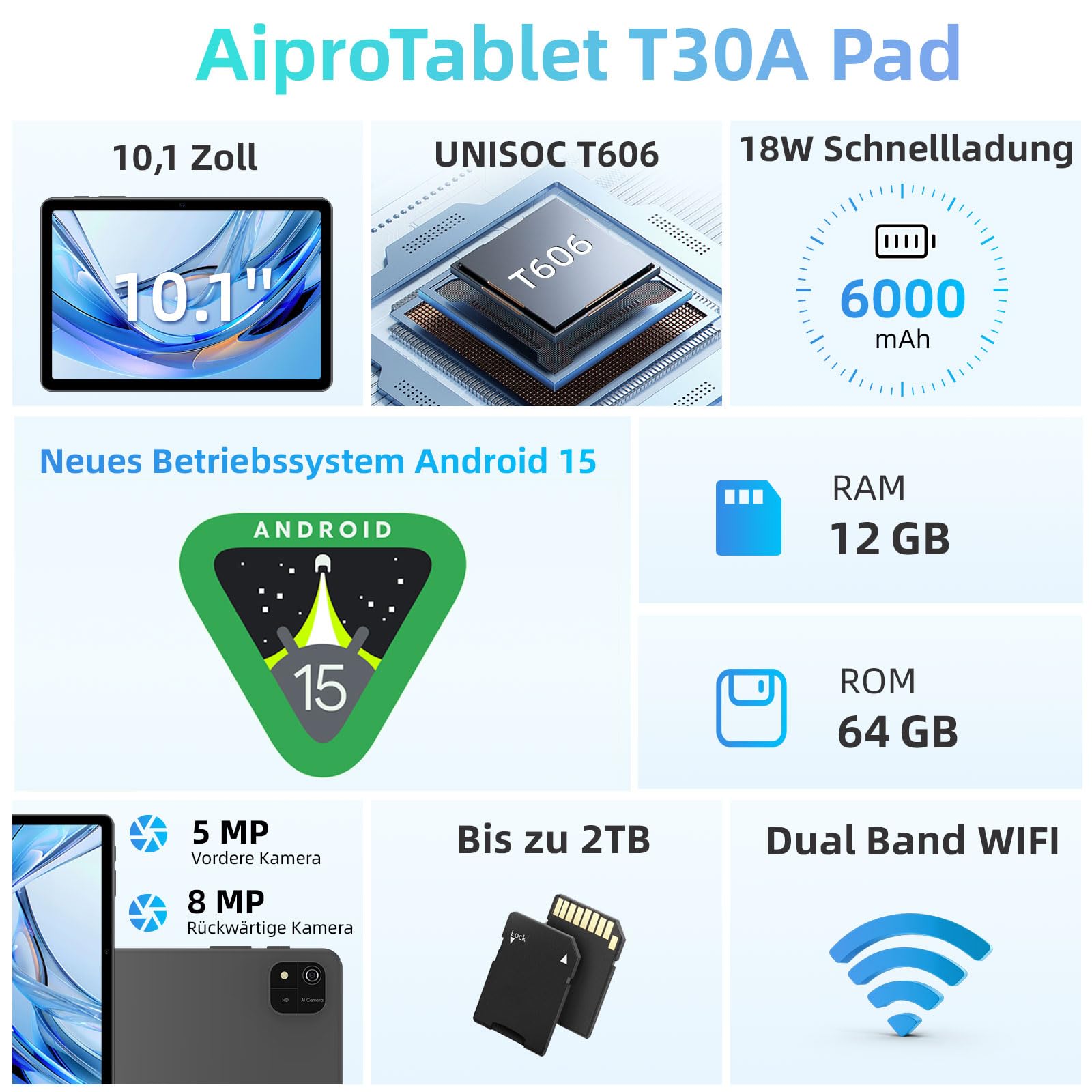 ["New Experience - The A30 Pad tablet is powered by the latest Android 15 operating system, which ensures wider app compatibility, faster boot times, and improved responsiveness. The new system offers more customization, data privacy, and security options without annoying ads.","High Performance - The JIKOCXN is powered by the UNISOC T606 Octa-Core processor, equipped with an ARM Cortex-A75 high-performance CPU and Mali-G57 GPU, providing smooth and efficient operation of most apps and seamless multitasking.","Sufficient Storage - The Android 15 tablet features 12GB of LPDDR4x memory (4GB physical + 8GB virtual) and 64GB of high-speed storage, expandable up to 2TB with a microSD card. This gives you plenty of space for all your favorite media, including videos, photos, and more.","Long-Lasting Battery - With a 6000mAh battery, you can read, watch videos, and browse the internet for up to 8 hours. With the Type-C port and 18W PD fast charging, the tablet can be fully charged in just about 2 hours, saving you valuable waiting time.","Large Touchscreen - The 10.1-inch tablet features a 1280x800 In-Cell IPS display with a 16:10 aspect ratio, providing vibrant colors and clear images for an enhanced viewing experience. The custom case not only protects the tablet but also serves as a convenient stand."]