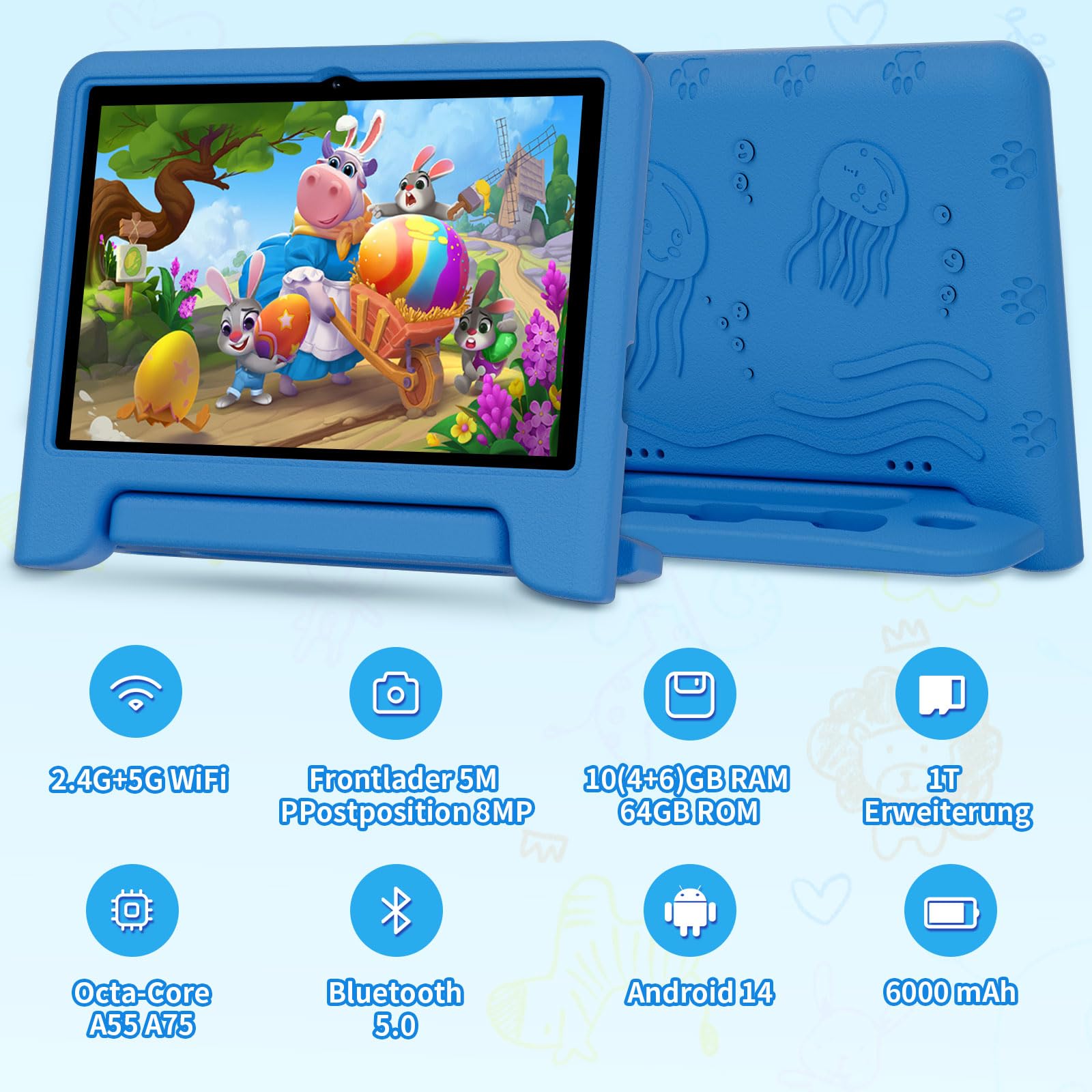JIKOCXN Kids Tablet 10 Inch, Octa Core Android 10 Tablet for Kids, 10GB RAM+64GB ROM, 1280x800 LCD Touchscreens, 6000mAh, WiFi 5, BT5.0, Dual Camera, GPS (Blue)