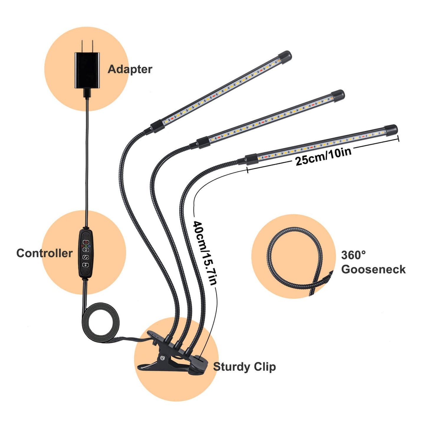 ["【Ideal Full Spectrum】This LED plant lamp uses full spectrum warm light 3000K, white light 5000K, and red light 660nm LEDs, close to natural sunlight, suitable for all types of indoor plants in all growth stages, the colors are also pleasant for the eyes.","【Automatic Cycle On/Off】This LED plant lamp has a cycle memory timing function, can set the timer to 3/9/12 hours, with continuous power supply, the growth light will automatically turn on and off at the same time the next day.","【360° Flexible Gooseneck & Strong Clip】The 3-head plant lamp for indoor plants with 360° flexible stainless steel gooseneck, easy to adjust the distance and angle between light and plants. Anti-slip clip that can be securely clamped anywhere.","【3 Light Modes & 10 Dimming Levels】The full spectrum plant lamp has 3 light modes (white light, warm+red light, and all lights on), meeting the needs of different plant growth phases. 10 brightness levels for adjustment.","【Customer Service and Warranty】All our LED plant lights have obtained CE, RoHS, FCC certificates, please rest assured of the quality. We offer 12 months warranty and 30 days refund guarantee, if you have any problem, please feel free to contact us, our after-sales support will reply to you within 24h ASAP."]