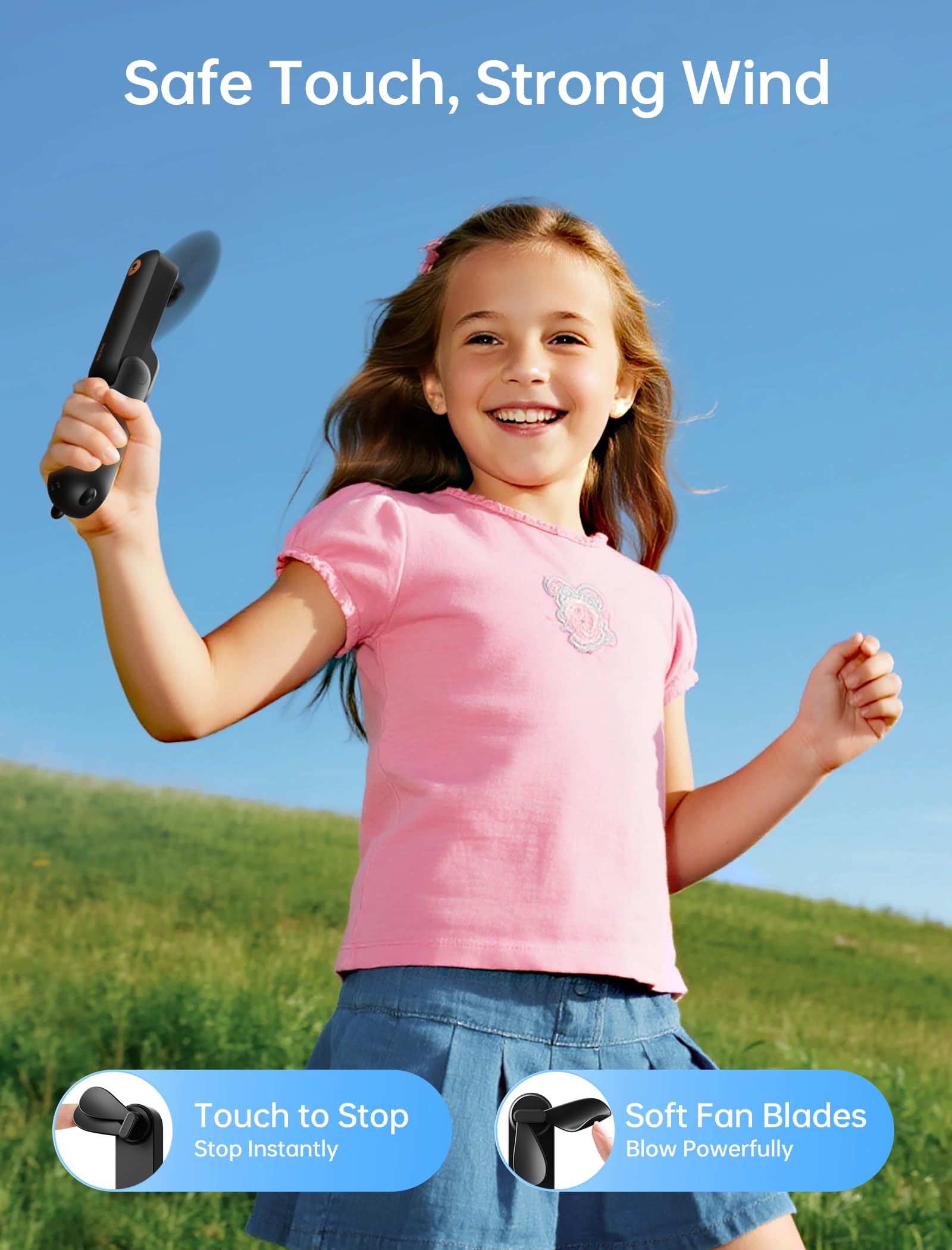 ["USB Rechargeable and Touchable Blades"] This USB Rechargeable Hand Fan can be charged via computer, laptop, or USB power adapter. It only takes 2-3 hours to fully charge. With special soft TPE material, the fan blades are very safe. If you accidentally touch the rotating blades, the soft blades will automatically stop and protect you.