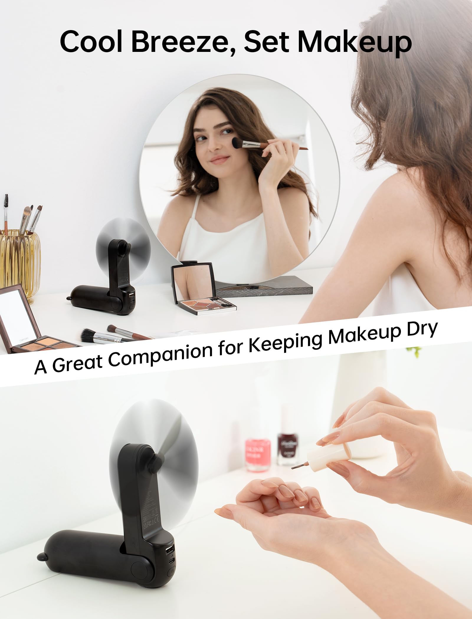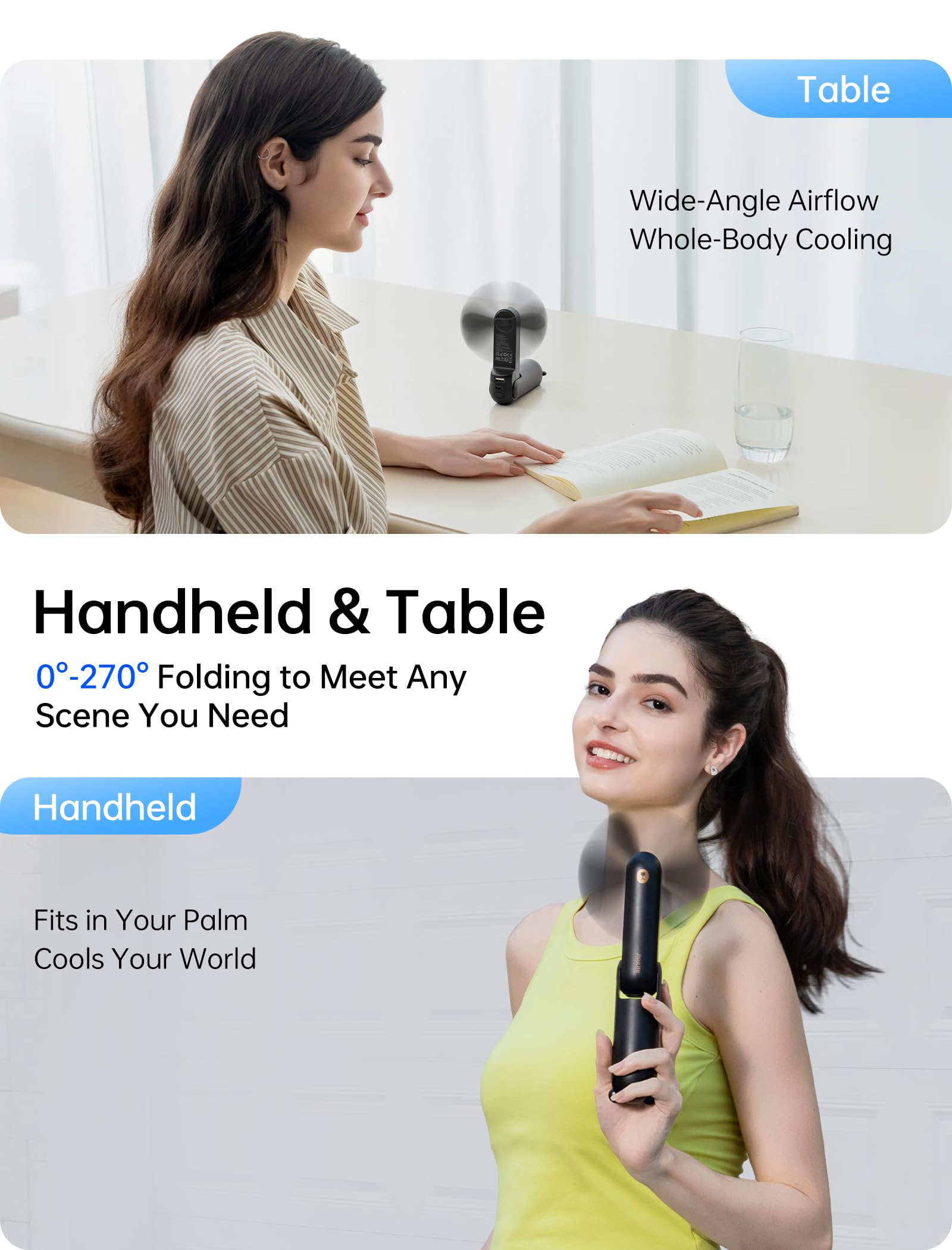 ["Long Battery Life"] The Mini USB Fan is equipped with a built-in 4500mAh battery that supports 20-37 hours of operation. 37 hours of operation at speed level 1, 33 hours of operation at speed level 2, and 20 hours of operation at speed level 3 on a full charge, allowing you to enjoy the fan all day at outdoor or indoor events.