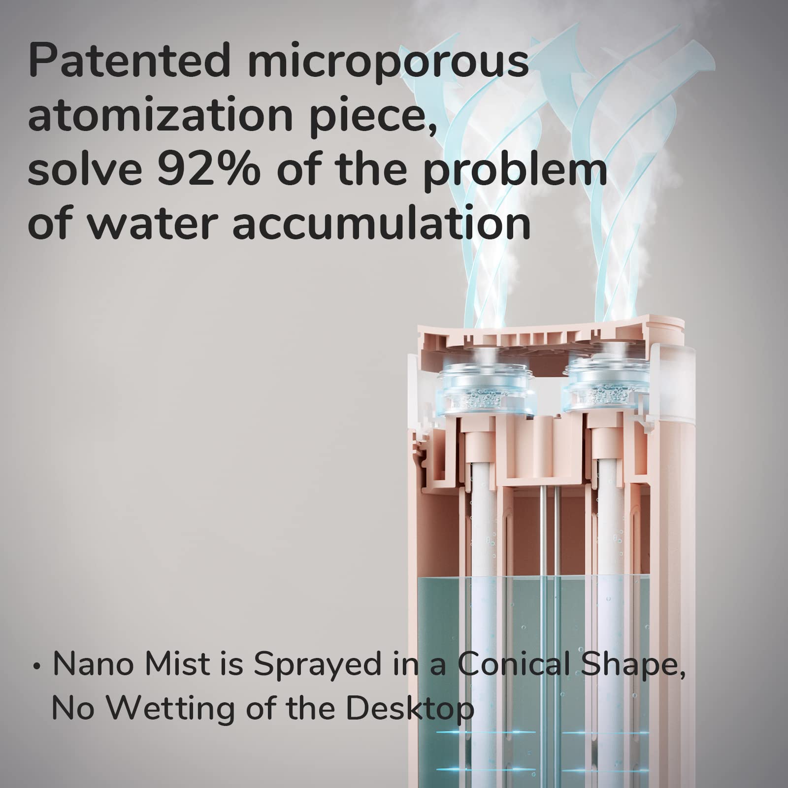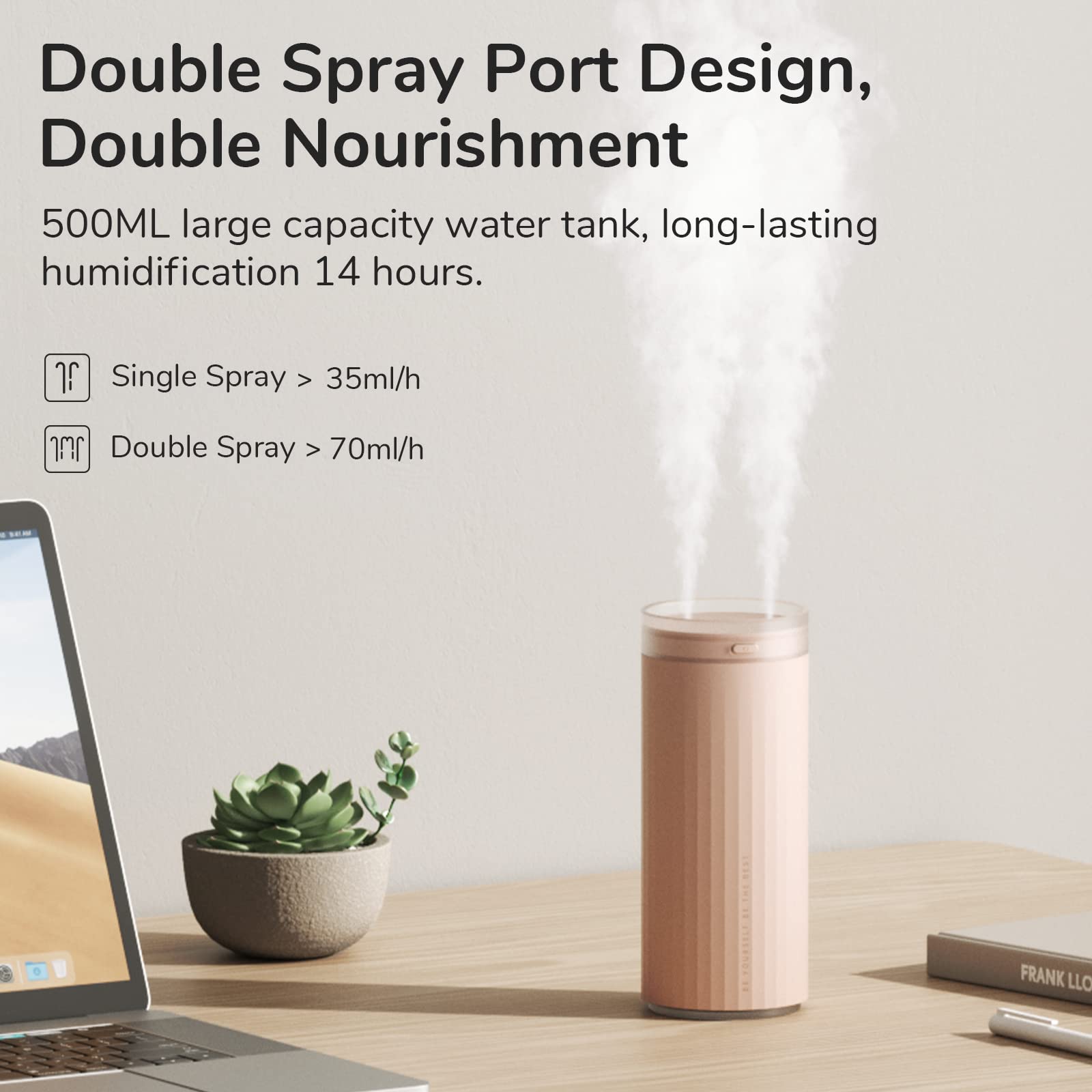 ["Focus on personal space humidity: JISULIFE Mini Humidifier with microporous atomizing piece, unlimited water quality, available distilled water and pure water, uniform and fine mist, ultrasonic ceramic piece high-frequency break water molecules, nano-fine mist hydration effect increased by 60%","Wireless 14-hour lasting humidity: JISULIFE small humidifier built-in 4000mAh large battery, single spray can run for 14 hours, double spray available 7 hours, wireless tangle-free humidification, suitable for bedroom bedside table room nursery plant car travel office desktop","Dual spray port design, double nutrient supply: JISULIFE portable humidifier with 500ml water tank, with dual spray port design, intermittent single spray > 35ml/h, continuous double spray > 70ml/h, gushing large mist volume, effective humidification rate up to 98%, can be adjusted according to different ambient humidity, enjoy comfortable humidity","Moisturizing safety, more attention: JISULIFE battery-operated humidifier uses intelligent chip and physical probe to provide triple protection against dryness, the top cover lifts off the power, water shortage protection shuts off and self-discharges automatically, safe and easy to use","28dB Silent Humidification: JISULIFE personal humidifier uses the latest ultrasonic technology for quieter operation, noise less than 28dB, which will not disturb you, even in your office/bedroom. (Please make sure the cotton core is soaked for 5-10 minutes before turning it on)"]