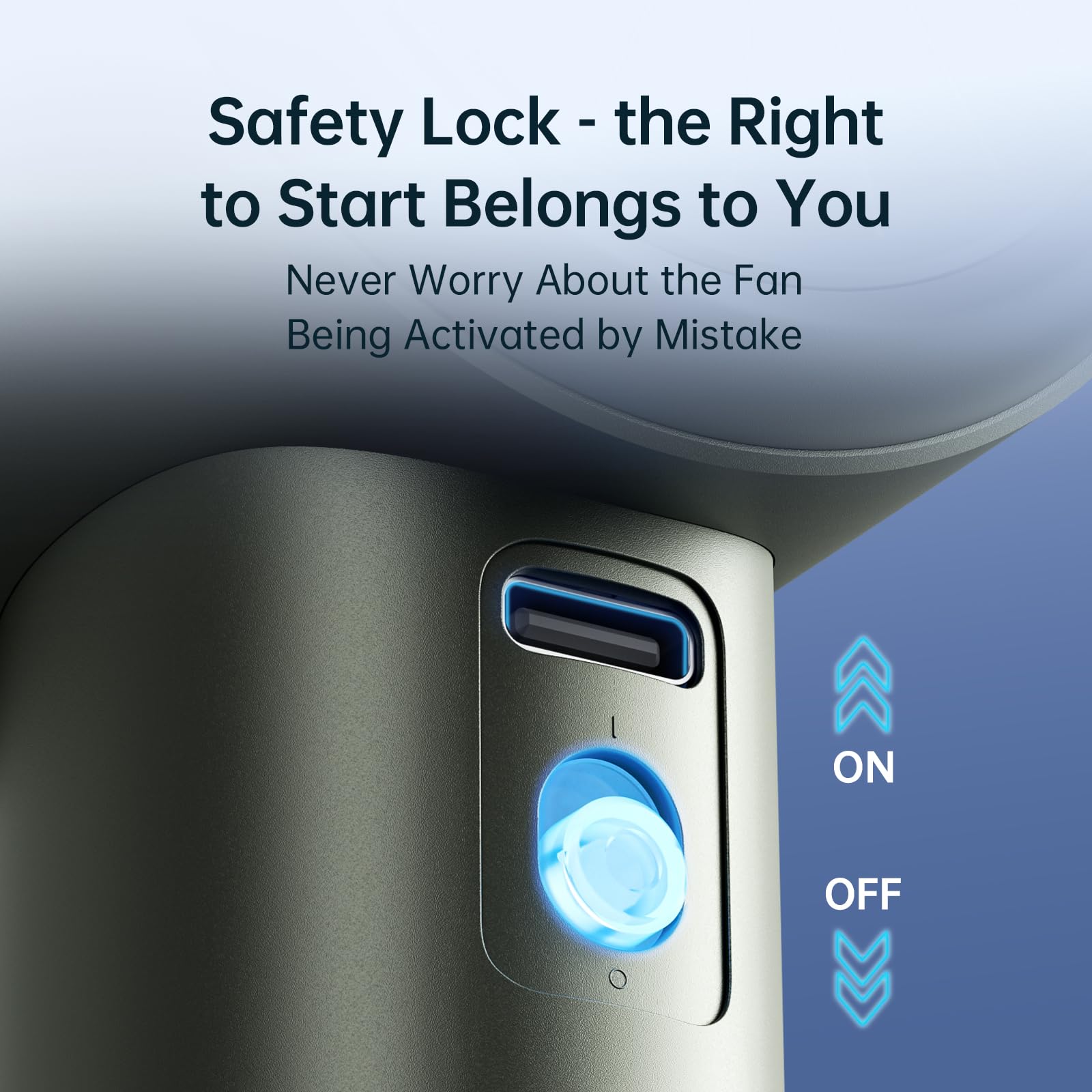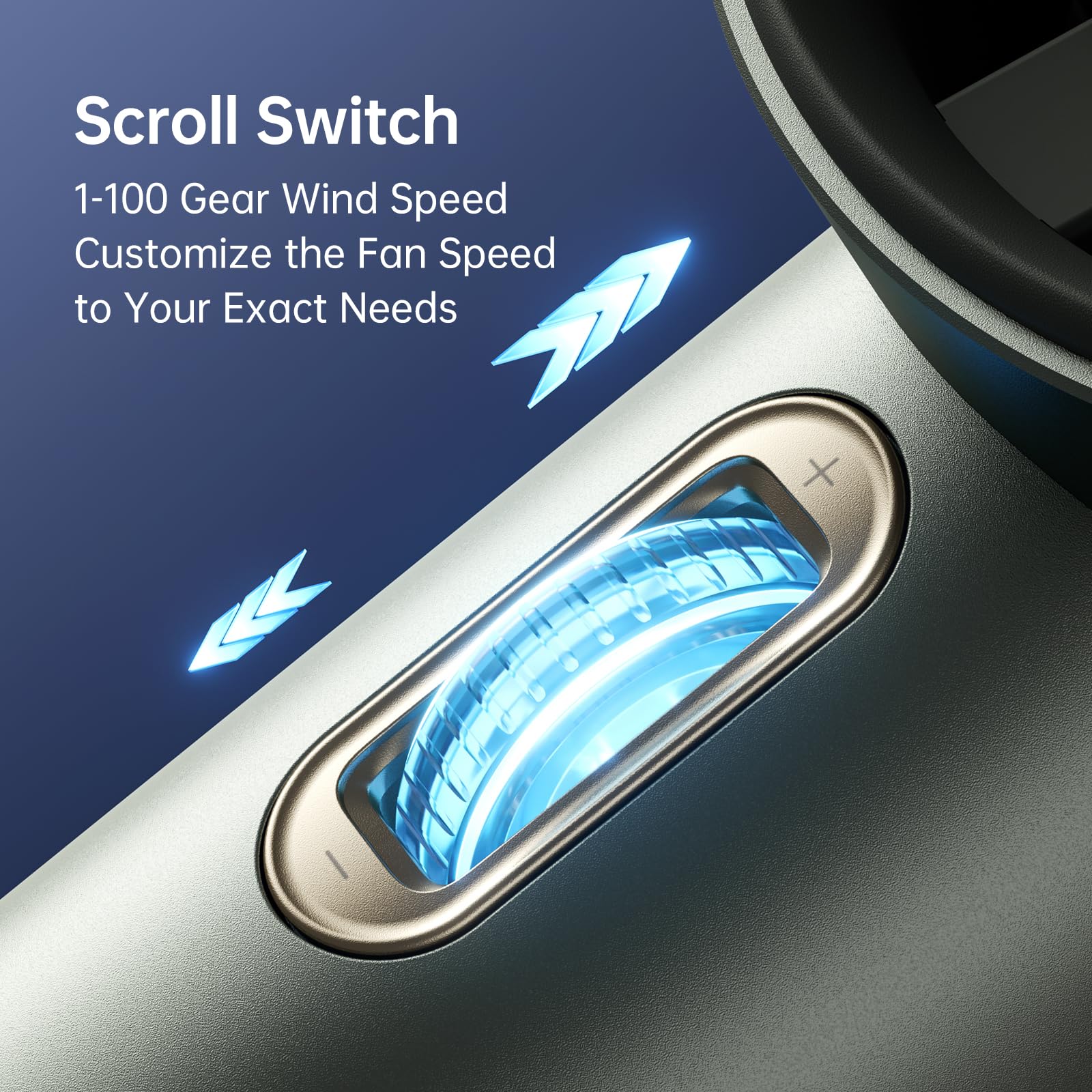 ["Scroll Switch - Customizable Wind Speed"] This small fan uses a scroll switch design, and the wind speed can be adjusted continuously. The portable fan can customize speeds from 1 to 100 individually to meet your different wind power needs in any situation.