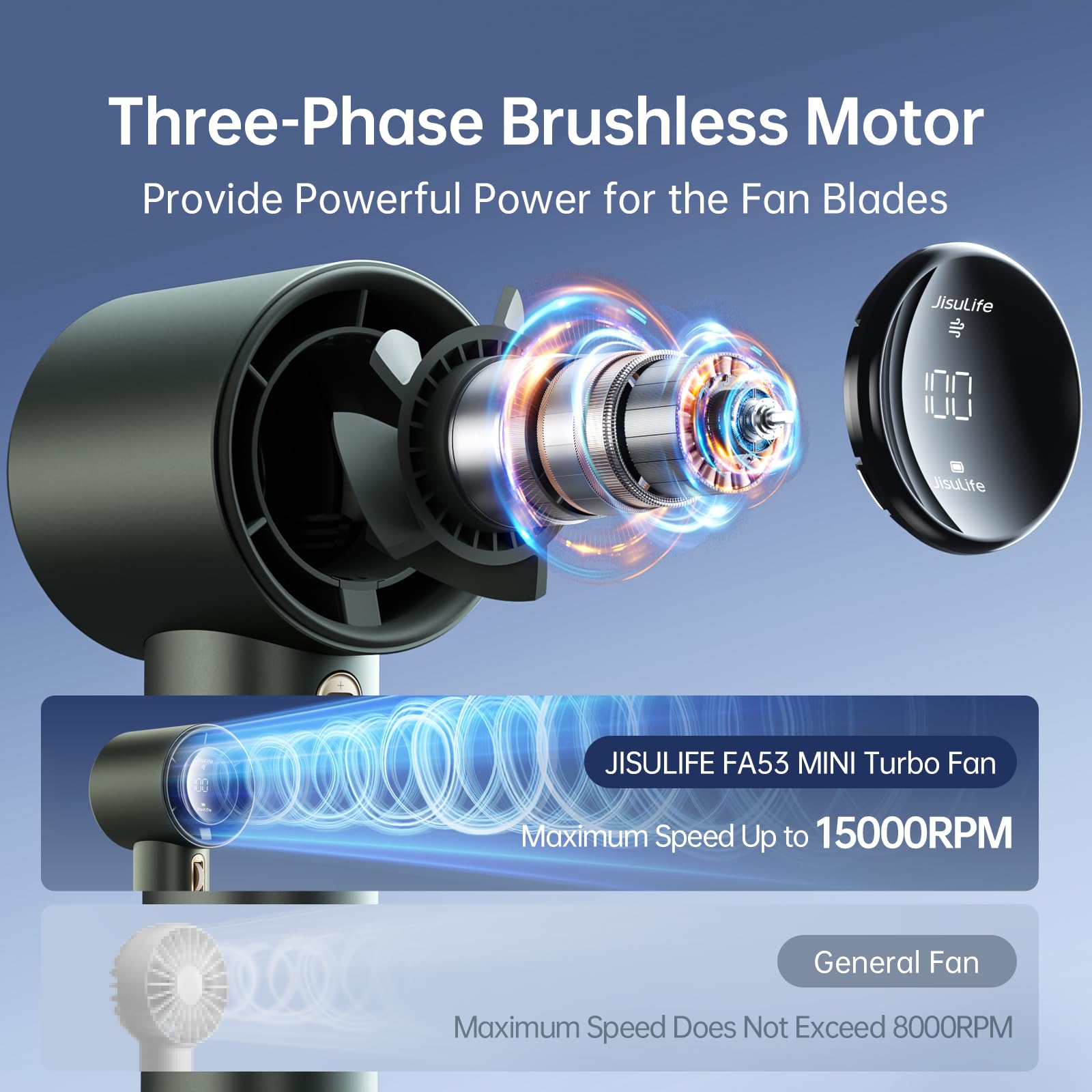 ["Brushless Motor - Super Power"] The combination of a three-phase brushless motor and a 3600mAh battery significantly improves the wind speed, power, and endurance. The maximum wind speed can reach 9 m/s. The highest rotation speed of the handheld fan is three times higher than that of an ordinary personal fan and reaches up to 15000 RPM. It can cool for 2 to 12 hours on a single charge.