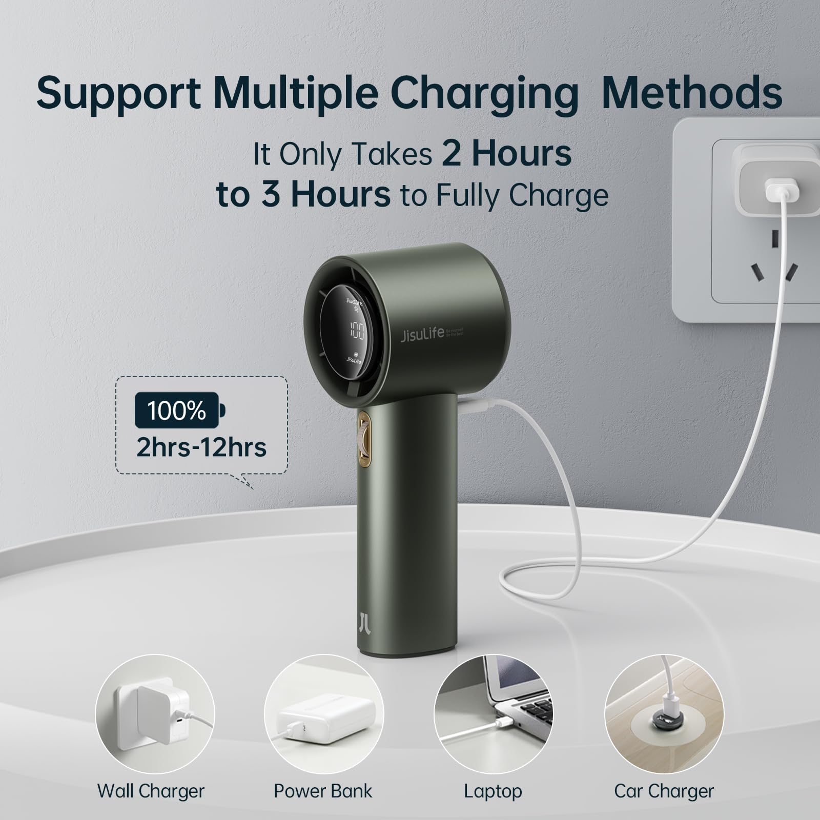 ["Multiple Charging Methods - More Convenience"] This USB rechargeable fan can be fully charged in just 2-3 hours and provides up to 12 hours of cooling time after a full charge. This battery-operated fan also comes with an additional USB Type-A (0.5m) cable, so you can use it with a regular USB socket, laptop, power bank, or car charger.