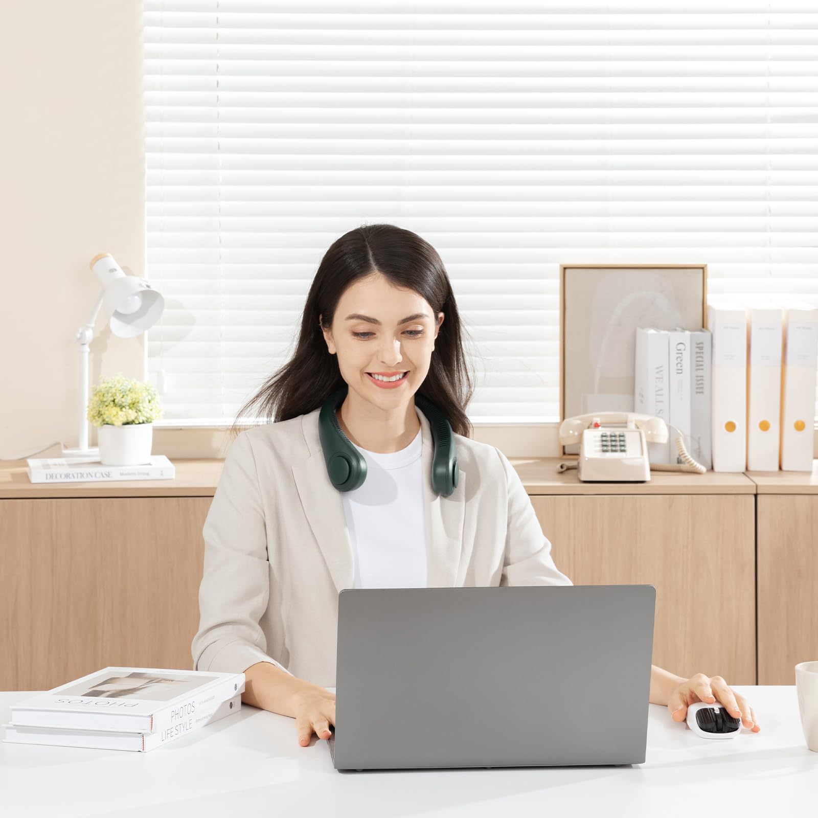 ["Safety and 360° air movement: A novel neck fan that releases wind without the need to wave your hands by simply placing it around your neck. Designed without blades, it can be safely used by children and older people. The neck fan can distribute air around 360°, allowing it to be used all around the face and generate enough air to keep you cool at all times. Ideal companion for working in hot weather.", "Hands-free design & fashionable: The hands-free neck fan is designed like a headset, allowing you to have your hands free anywhere you go. The fashionable style makes you look cool and you can take it anywhere in hot weather. Also a great fashion piece for your OOTD!", "4-16 hours of operation and 5 speeds: 4000 mAh high-capacity batteries allow for an operating time of 4-16 hours (depending on speed). Adjust the appropriate speed by repeatedly pressing the power button. The 3 to 5 speed setting provides customers with more choices.", "Low-noise design & comfort: The motor of the portable neck fan has been modified to generate sounds of at least 25 dB during operation. It is sufficient to hear only your own breath. Made of grease-free ABS and silicone. Makes the hands-free neck fan softer and quieter.", "Compact design: Neck fans weigh only about 260 g and are ultra-lightweight, reducing the burden on the neck. You don't have to worry about your hair getting caught in the blades. Jisulife has a dedicated packaging design team, and the packaging is very structured. They make great gifts for mom, dad, wife, husband, kids, and friends."]