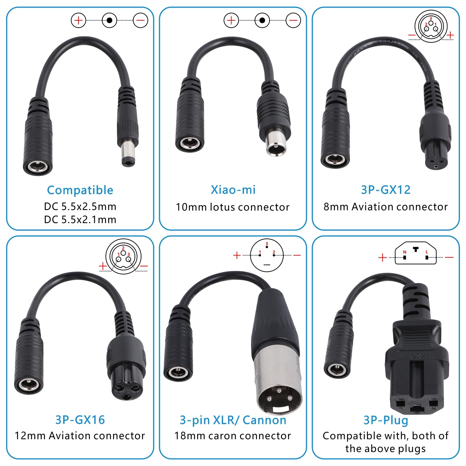 ["🛴【Universal Charger 42V 2A】The charger for scooters has 6 types of connectors, fully compatible with electric scooters, balance scooters, drift bikes, unicycles, and e-bikes. (For XIAOMI, DC5.5 x 2.1mm, DC5.5 x 2.5mm, 3P-GX12, 3P-GX16, 12mm plug) Please carefully check the size and connector of the original charger before ordering","🔋【Safety Protection】Overvoltage/Overheating/Short circuit protection, overload protection, multiple safety protection design, safer to use. Electric scooter charger input: 100-240 VAC, output: 42V 2A","🛴【Good Heat Dissipation Design】Adopting aluminum heat sink, good heat dissipation design can better cool the power equipment. The charger will get slightly hot when working, which is the reaction of the charger's heat dissipation","🔋【Scooter Charger】The electric scooter charging cable is made of high-quality fire-resistant material, which is not easy to damage and has a long service life. To extend the battery life by 10 times, please avoid using the battery at less than 35% and do not charge it at more than 85-90%","🛴【LED Display Design】The electric scooter charger is equipped with an LED charging indicator, red light when charging, green light when the battery is fully charged. This charger is fully compatible with 5.5mm x 2.5mm and 5.5mm x 2.1mm DC smart scooters, please make sure the length and diameter of your device's DC charging head fits our product"]