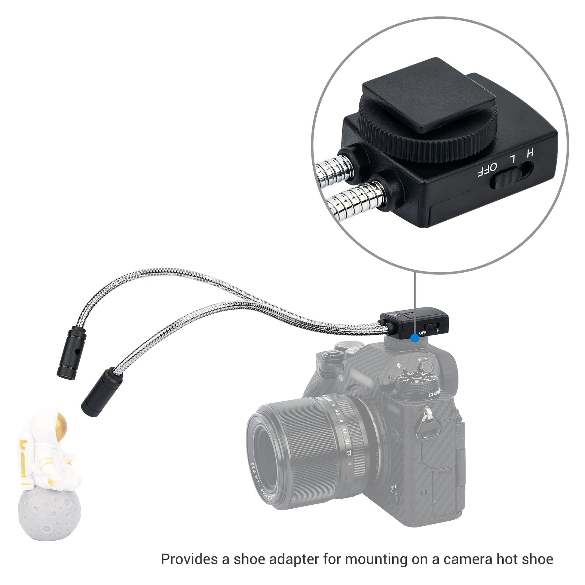 Flash shoe mount - The macro light is designed to sit on your camera's flash shoe. You can use the flexible gooseneck to position the lights so that your camera does not cast shadows on your subject. Includes 4 CR2025 batteries."