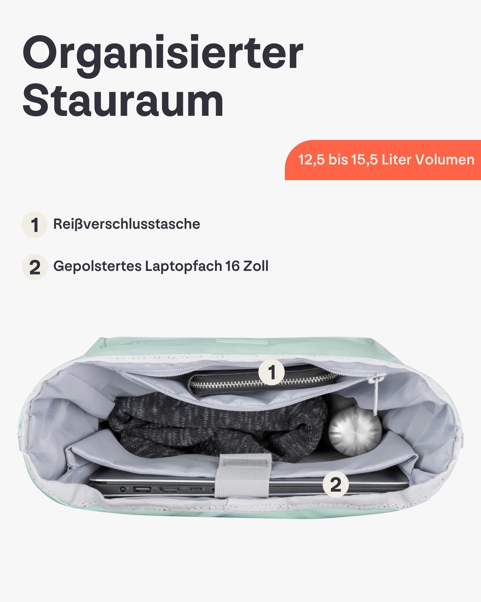 Johnny Urban backpack for women & men in mint color - Robin Medium - Rolltop design with laptop compartment for university, business, and cycling - 15L capacity - Sustainable and water repellent.