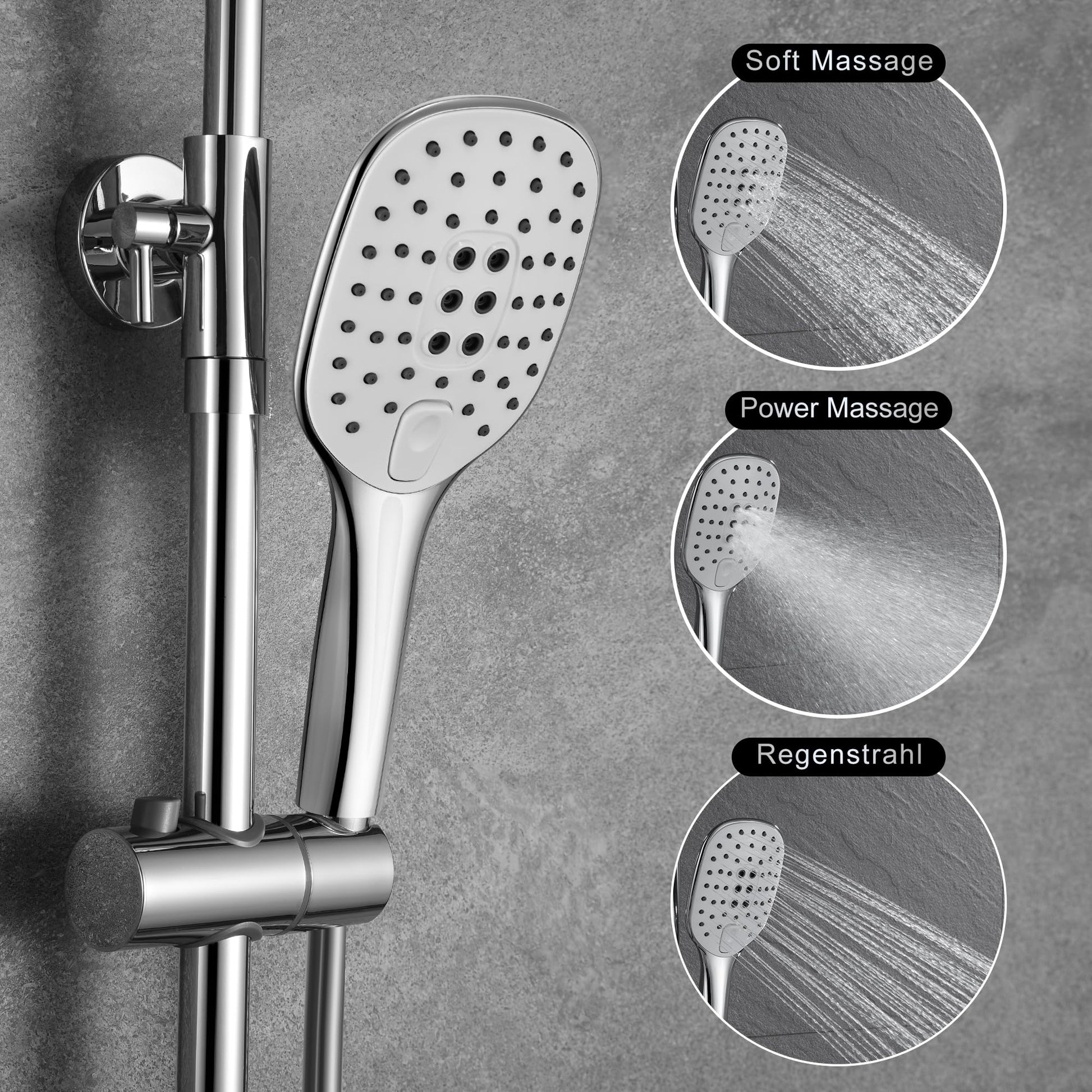XXL RAIN SHOWER: Mirror-effect 30x30cm overhead shower made of stainless steel with easy-to-clean anti-limescale nozzles and wide shower area. HAND SHOWER made of high-quality ABS, multi-functions, soft massage, rain, power massage.