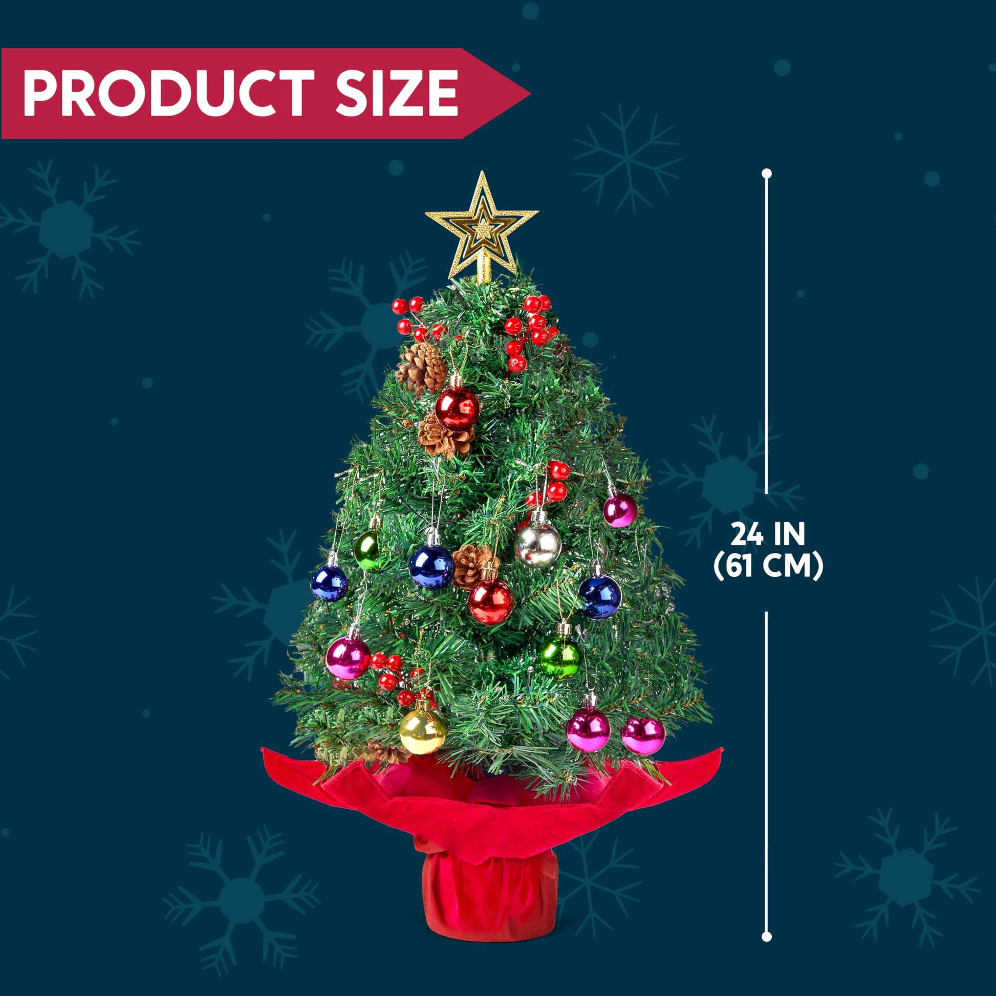 JOIEDOMI 24"/2FT Pre-lit Tabletop Christmas Tree with warm lights, holly berries, and pine cones for a beautiful Christmas decoration.