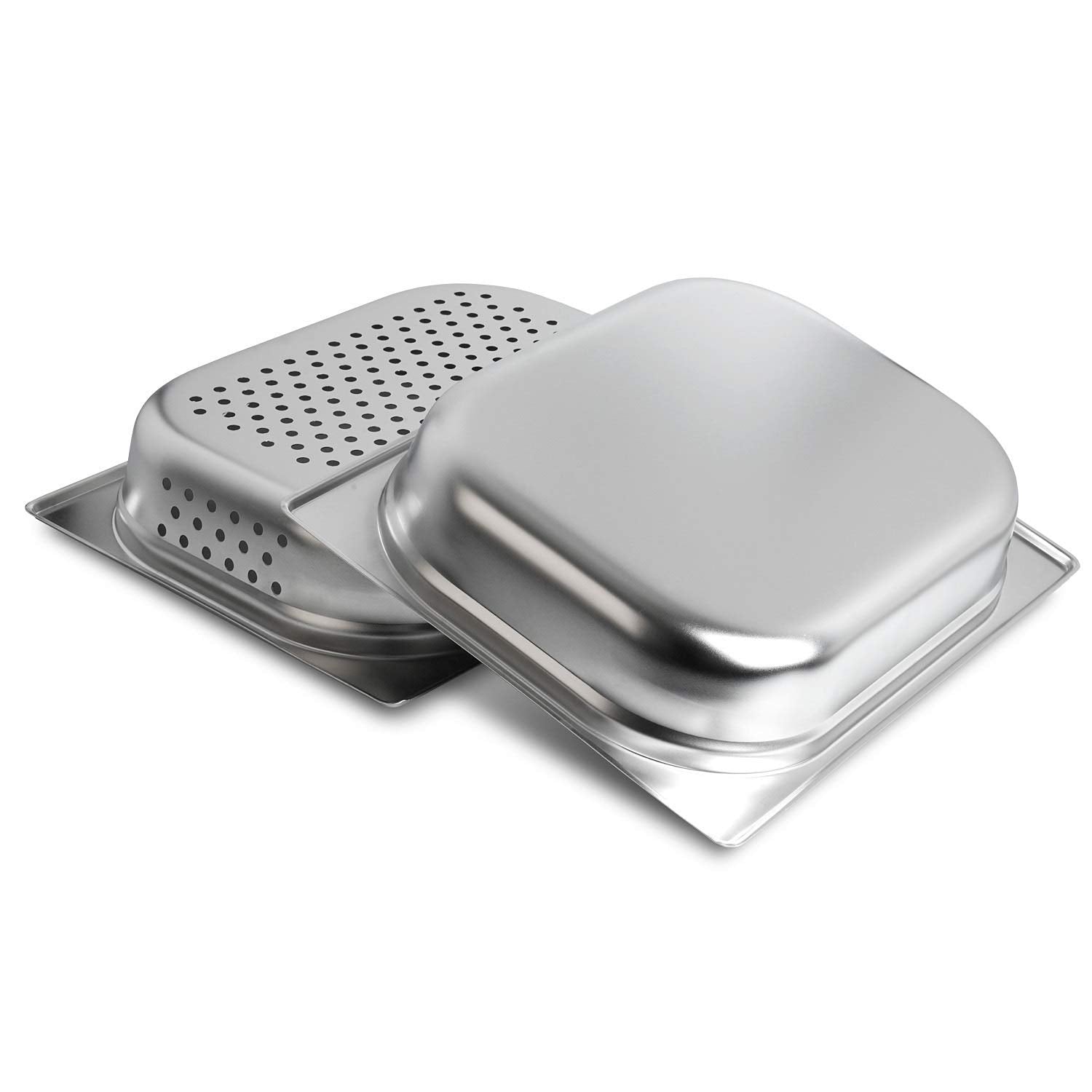 ["Multifunctional Gastronorm containers, stainless steel steamer insert with a depth of 6.5cm and 4 liters capacity for steam ovens, warming drawers, and refrigerators","Our temperature-resistant GN inserts are designed for dishwasher cleaning to save you time. The containers can be stacked in the cabinet and stored space-saving","The containers comply with DIN 66075, stable corners prevent damage and guarantee a long service life. Depth: 65mm // Interior dimensions: 300x240mm // Exterior dimensions: 325x265mm","Suitable for steamers, chafing dishes, bain maries, salad bars, food warmers, as well as for presenting and storing food. Always well organized thanks to the practical Gastronorm system","Scope of delivery: 1x GN container 1/2 - 65 mm - unperforated + 1x GN container 1/2 - 65 mm - perforated (Gastronorm 2 pieces GN containers as a set in the advantage pack / starter set)"]