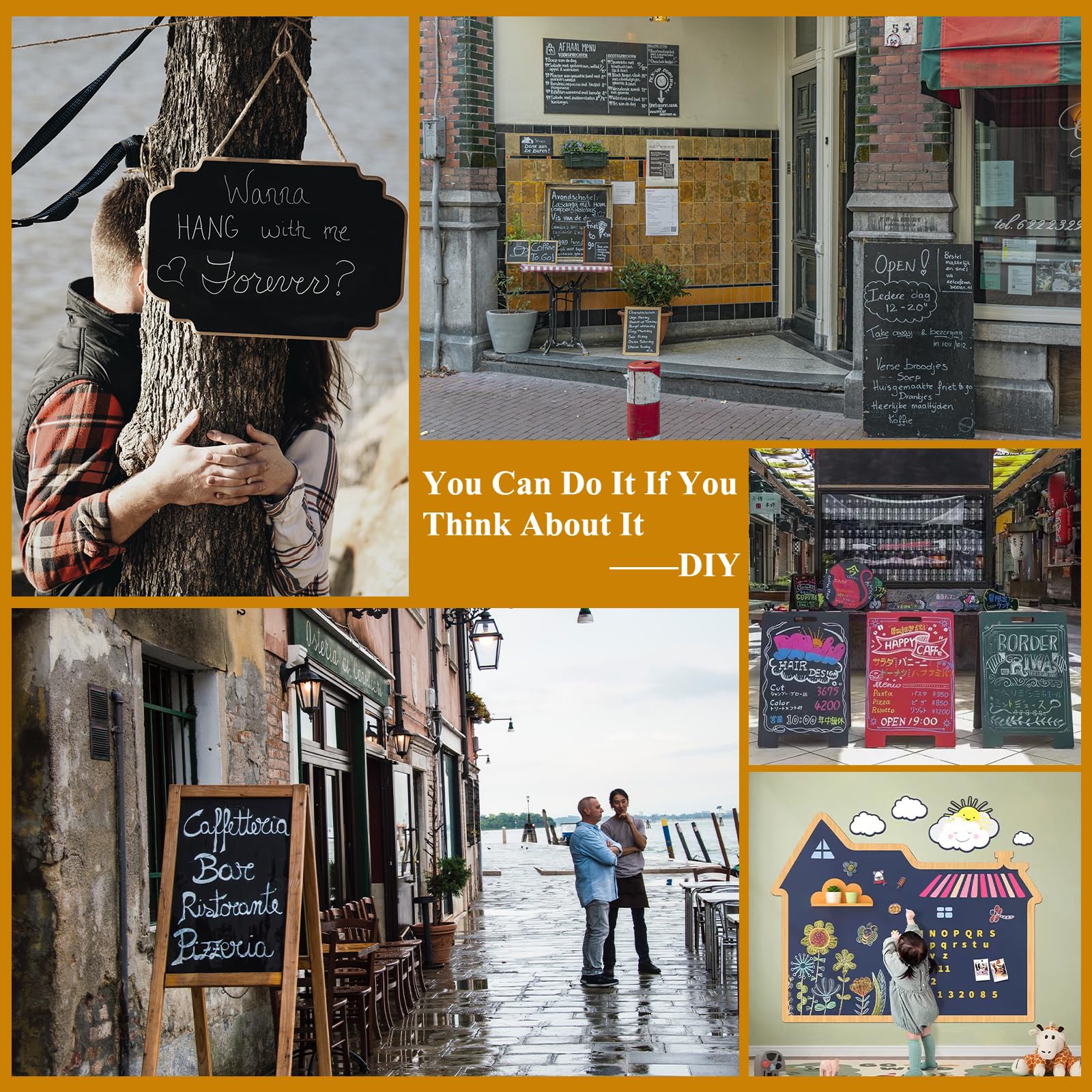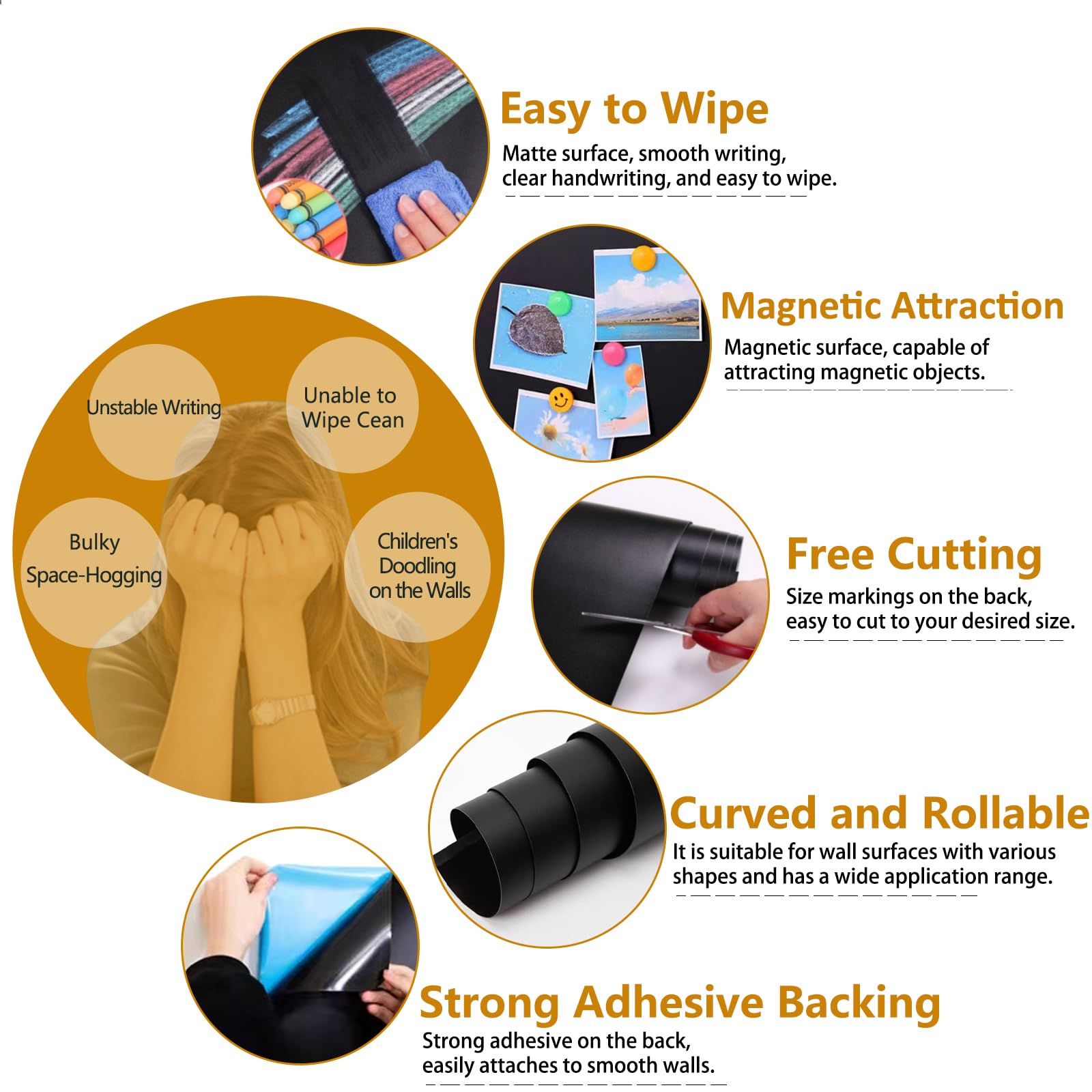 "✔️【Set content:】Magnetic blackboard foil + dust-free chalk * 6 (with pen sleeve) + magnetic nail * 3 (with our matching magnetic nail you can hold about 3 sheets of A4 paper) + wiping cloth1 , you can use it immediately without having to buy additional accessories.","⚡【 Magnetic attraction】The surface of the JOMUSAGA magnetic blackboard foil is compatible with magnets, you can use magnetic nails to attach schedules, notes, photos to the board. If you want to increase the magnetic force, you can buy stronger magnetic nails or stack two blackboard foils on top of each other.","📌【Removable adhesive】The self-adhesive blackboard foil has a high-quality, strong adhesive on the back, no tools required, no holes, just tear off and stick on. You can stick it anywhere, such as on walls, glass, refrigerators, old whiteboards, etc.","✂️【Cutting free】On the back of the JOMUSAGA blackboard foil are measurements, so you and your children can cut the foil to your liking. You can use it for presentations in the office or classroom, for advertising signs, as a photo wall, pinboard, or graffiti wall.","✏️【Easy to write on and clean】The blackboard foil has a thickness of approximately 0.62 mm, the writing feel is pleasant. The surface is made of PP film, matte, smooth to write on, easy to wipe off, clear handwriting. Chalk or markers can be used for writing. The writing can be easily wiped off with a damp cloth or sponge."