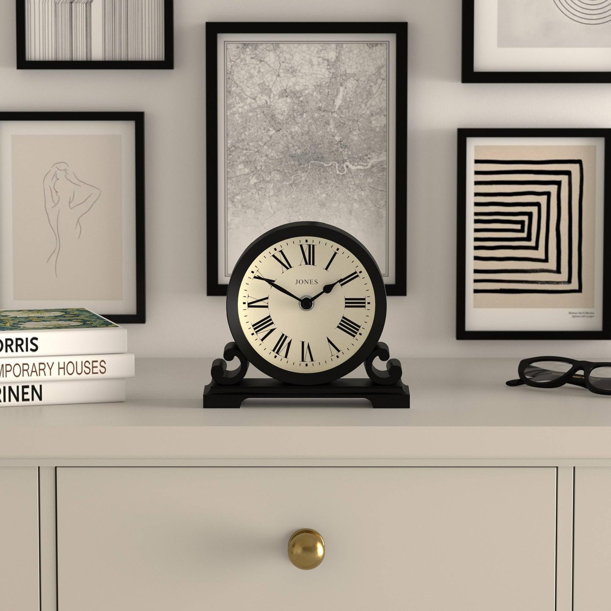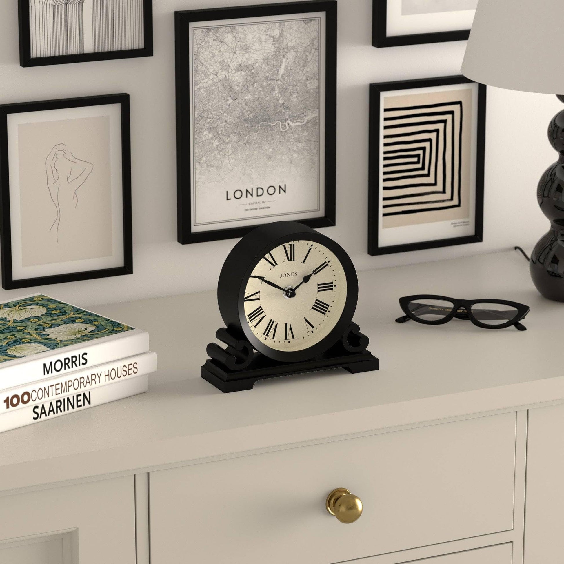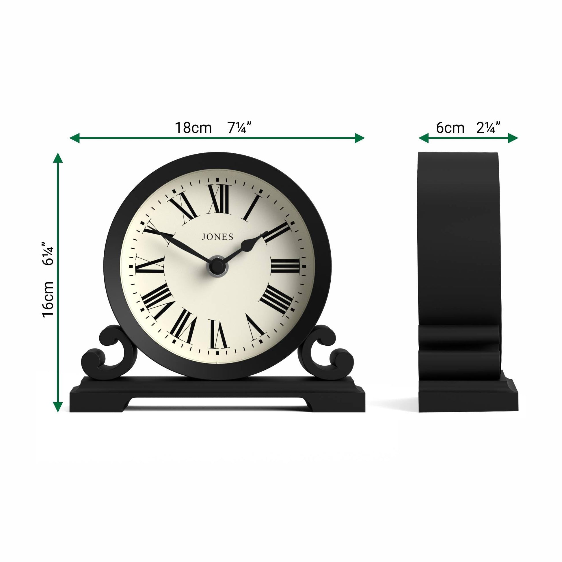 ["Dimensions 16 x 18 x 6 cm / 6.5 x 7 x 2.5 inches.","Exclusively designed and manufactured by Jones Clocks.","A modern interpretation of a classic scroll mantle clock made from high-quality acrylic in a contemporary matte finish with a glass lens, featuring a traditional dial with Roman numerals.","Perfect style and size for your mantelpiece, desk, table, bedside table, sideboard, or shelf.","Precise and reliable quartz clock movement with quiet ticking. Requires 1 x high-quality brand alkaline AA battery (not included)."]